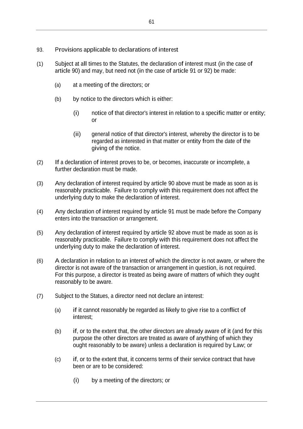 61 93. Provisions applicable to declarations of interest (1) Subject at all times to the Statutes, the declaration of interest must (in the case of article 90) and may, but need not (in the case of article 91 or 92) be made: (a) at a meeting of the directors; or (b) by notice to the directors which is either: (i) notice of that director's interest in relation to a specific matter or entity; or (ii) general notice of that director's interest, whereby the director is to be regarded as interested in that matter or entity from the date of the giving of the notice. (2) If a declaration of interest proves to be, or becomes, inaccurate or incomplete, a further declaration must be made. (3) Any declaration of interest required by article 90 above must be made as soon as is reasonably practicable. Failure to comply with this requirement does not affect the underlying duty to make the declaration of interest. (4) Any declaration of interest required by article 91 must be made before the Company enters into the transaction or arrangement. (5) Any declaration of interest required by article 92 above must be made as soon as is reasonably practicable. Failure to comply with this requirement does not affect the underlying duty to make the declaration of interest. (6) A declaration in relation to an interest of which the director is not aware, or where the director is not aware of the transaction or arrangement in question, is not required. For this purpose, a director is treated as being aware of matters of which they ought reasonably to be aware. (7) Subject to the Statues, a director need not declare an interest: (a) if it cannot reasonably be regarded as likely to give rise to a conflict of interest; (b) if, or to the extent that, the other directors are already aware of it (and for this purpose the other directors are treated as aware of anything of which they ought reasonably to be aware) unless a declaration is required by Law; or (c) if, or to the extent that, it concerns terms of their service contract that have been or are to be considered: (i) by a meeting of the directors; or