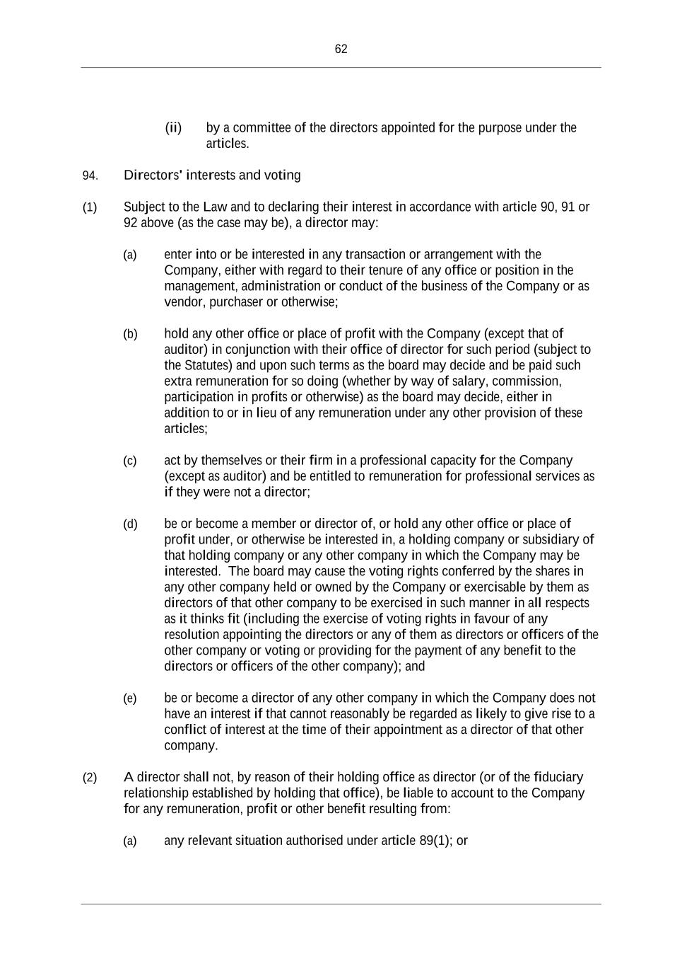 62 (ii) by a committee of the directors appointed for the purpose under the articles. 94. Directors' interests and voting (1) Subject to the Law and to declaring their interest in accordance with article 90, 91 or 92 above (as the case may be), a director may: (a) enter into or be interested in any transaction or arrangement with the Company, either with regard to their tenure of any office or position in the management, administration or conduct of the business of the Company or as vendor, purchaser or otherwise; (b) hold any other office or place of profit with the Company (except that of auditor) in conjunction with their office of director for such period (subject to the Statutes) and upon such terms as the board may decide and be paid such extra remuneration for so doing (whether by way of salary, commission, participation in profits or otherwise) as the board may decide, either in addition to or in lieu of any remuneration under any other provision of these articles; (c) act by themselves or their firm in a professional capacity for the Company (except as auditor) and be entitled to remuneration for professional services as if they were not a director; (d) be or become a member or director of, or hold any other office or place of profit under, or otherwise be interested in, a holding company or subsidiary of that holding company or any other company in which the Company may be interested. The board may cause the voting rights conferred by the shares in any other company held or owned by the Company or exercisable by them as directors of that other company to be exercised in such manner in all respects as it thinks fit (including the exercise of voting rights in favour of any resolution appointing the directors or any of them as directors or officers of the other company or voting or providing for the payment of any benefit to the directors or officers of the other company); and (e) be or become a director of any other company in which the Company does not have an interest if that cannot reasonably be regarded as likely to give rise to a conflict of interest at the time of their appointment as a director of that other company. (2) A director shall not, by reason of their holding office as director (or of the fiduciary relationship established by holding that office), be liable to account to the Company for any remuneration, profit or other benefit resulting from: (a) any relevant situation authorised under article 89(1); or
