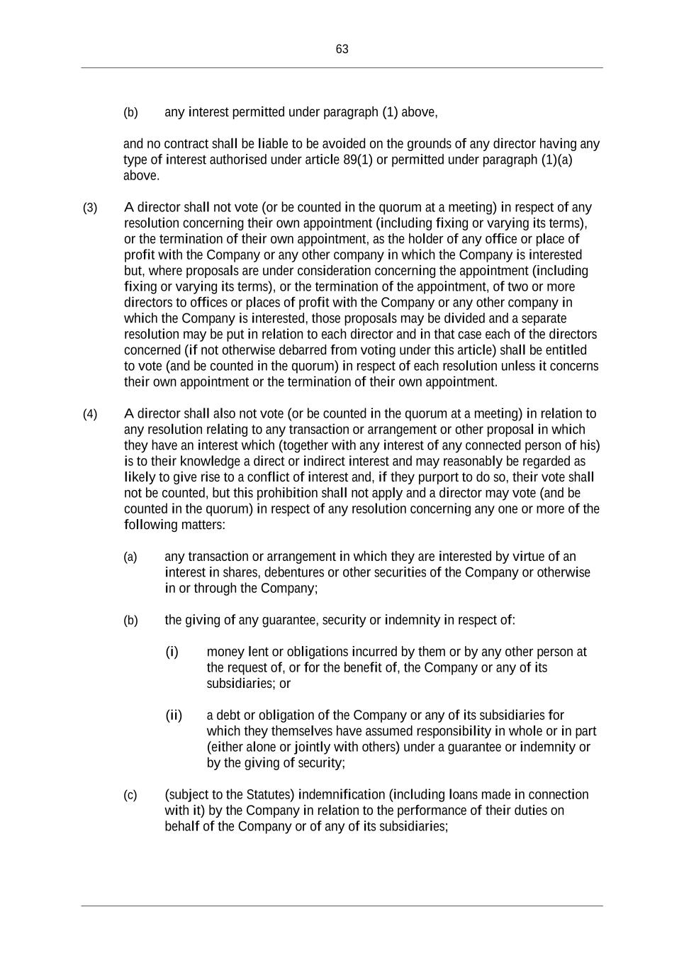 63 (b) any interest permitted under paragraph (1) above, and no contract shall be liable to be avoided on the grounds of any director having any type of interest authorised under article 89(1) or permitted under paragraph (1)(a) above. (3) A director shall not vote (or be counted in the quorum at a meeting) in respect of any resolution concerning their own appointment (including fixing or varying its terms), or the termination of their own appointment, as the holder of any office or place of profit with the Company or any other company in which the Company is interested but, where proposals are under consideration concerning the appointment (including fixing or varying its terms), or the termination of the appointment, of two or more directors to offices or places of profit with the Company or any other company in which the Company is interested, those proposals may be divided and a separate resolution may be put in relation to each director and in that case each of the directors concerned (if not otherwise debarred from voting under this article) shall be entitled to vote (and be counted in the quorum) in respect of each resolution unless it concerns their own appointment or the termination of their own appointment. (4) A director shall also not vote (or be counted in the quorum at a meeting) in relation to any resolution relating to any transaction or arrangement or other proposal in which they have an interest which (together with any interest of any connected person of his) is to their knowledge a direct or indirect interest and may reasonably be regarded as likely to give rise to a conflict of interest and, if they purport to do so, their vote shall not be counted, but this prohibition shall not apply and a director may vote (and be counted in the quorum) in respect of any resolution concerning any one or more of the following matters: (a) any transaction or arrangement in which they are interested by virtue of an interest in shares, debentures or other securities of the Company or otherwise in or through the Company; (b) the giving of any guarantee, security or indemnity in respect of: (i) money lent or obligations incurred by them or by any other person at the request of, or for the benefit of, the Company or any of its subsidiaries; or (ii) a debt or obligation of the Company or any of its subsidiaries for which they themselves have assumed responsibility in whole or in part (either alone or jointly with others) under a guarantee or indemnity or by the giving of security; (c) (subject to the Statutes) indemnification (including loans made in connection with it) by the Company in relation to the performance of their duties on behalf of the Company or of any of its subsidiaries;