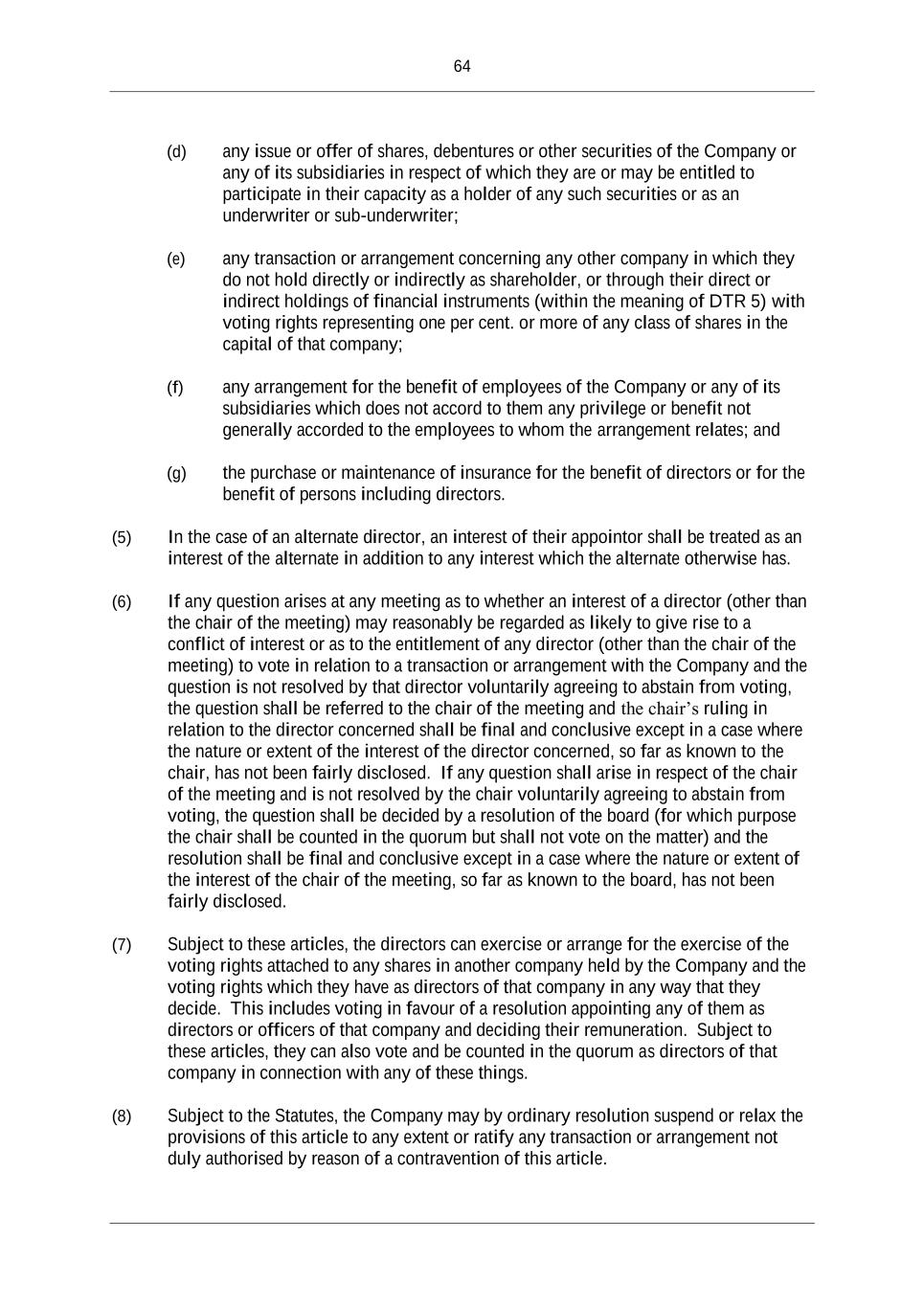 64 (d) any issue or offer of shares, debentures or other securities of the Company or any of its subsidiaries in respect of which they are or may be entitled to participate in their capacity as a holder of any such securities or as an underwriter or sub-underwriter; (e) any transaction or arrangement concerning any other company in which they do not hold directly or indirectly as shareholder, or through their direct or indirect holdings of financial instruments (within the meaning of DTR 5) with voting rights representing one per cent. or more of any class of shares in the capital of that company; (f) any arrangement for the benefit of employees of the Company or any of its subsidiaries which does not accord to them any privilege or benefit not generally accorded to the employees to whom the arrangement relates; and (g) the purchase or maintenance of insurance for the benefit of directors or for the benefit of persons including directors. (5) In the case of an alternate director, an interest of their appointor shall be treated as an interest of the alternate in addition to any interest which the alternate otherwise has. (6) If any question arises at any meeting as to whether an interest of a director (other than the chair of the meeting) may reasonably be regarded as likely to give rise to a conflict of interest or as to the entitlement of any director (other than the chair of the meeting) to vote in relation to a transaction or arrangement with the Company and the question is not resolved by that director voluntarily agreeing to abstain from voting, the question shall be referred to the chair of the meeting and the chair’s ruling in relation to the director concerned shall be final and conclusive except in a case where the nature or extent of the interest of the director concerned, so far as known to the chair, has not been fairly disclosed. If any question shall arise in respect of the chair of the meeting and is not resolved by the chair voluntarily agreeing to abstain from voting, the question shall be decided by a resolution of the board (for which purpose the chair shall be counted in the quorum but shall not vote on the matter) and the resolution shall be final and conclusive except in a case where the nature or extent of the interest of the chair of the meeting, so far as known to the board, has not been fairly disclosed. (7) Subject to these articles, the directors can exercise or arrange for the exercise of the voting rights attached to any shares in another company held by the Company and the voting rights which they have as directors of that company in any way that they decide. This includes voting in favour of a resolution appointing any of them as directors or officers of that company and deciding their remuneration. Subject to these articles, they can also vote and be counted in the quorum as directors of that company in connection with any of these things. (8) Subject to the Statutes, the Company may by ordinary resolution suspend or relax the provisions of this article to any extent or ratify any transaction or arrangement not duly authorised by reason of a contravention of this article.