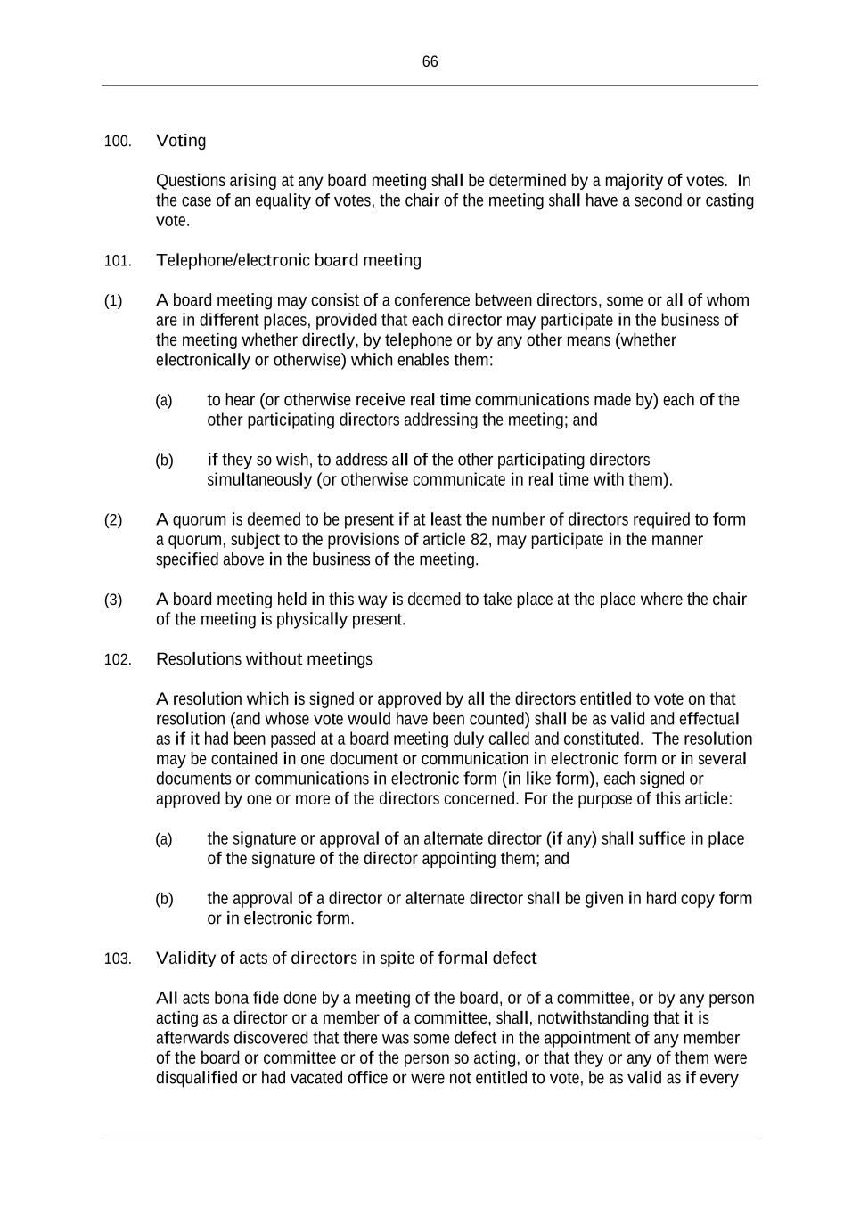 66 100. Voting Questions arising at any board meeting shall be determined by a majority of votes. In the case of an equality of votes, the chair of the meeting shall have a second or casting vote. 101. Telephone/electronic board meeting (1) A board meeting may consist of a conference between directors, some or all of whom are in different places, provided that each director may participate in the business of the meeting whether directly, by telephone or by any other means (whether electronically or otherwise) which enables them: (a) to hear (or otherwise receive real time communications made by) each of the other participating directors addressing the meeting; and (b) if they so wish, to address all of the other participating directors simultaneously (or otherwise communicate in real time with them). (2) A quorum is deemed to be present if at least the number of directors required to form a quorum, subject to the provisions of article 82, may participate in the manner specified above in the business of the meeting. (3) A board meeting held in this way is deemed to take place at the place where the chair of the meeting is physically present. 102. Resolutions without meetings A resolution which is signed or approved by all the directors entitled to vote on that resolution (and whose vote would have been counted) shall be as valid and effectual as if it had been passed at a board meeting duly called and constituted. The resolution may be contained in one document or communication in electronic form or in several documents or communications in electronic form (in like form), each signed or approved by one or more of the directors concerned. For the purpose of this article: (a) the signature or approval of an alternate director (if any) shall suffice in place of the signature of the director appointing them; and (b) the approval of a director or alternate director shall be given in hard copy form or in electronic form. 103. Validity of acts of directors in spite of formal defect All acts bona fide done by a meeting of the board, or of a committee, or by any person acting as a director or a member of a committee, shall, notwithstanding that it is afterwards discovered that there was some defect in the appointment of any member of the board or committee or of the person so acting, or that they or any of them were disqualified or had vacated office or were not entitled to vote, be as valid as if every