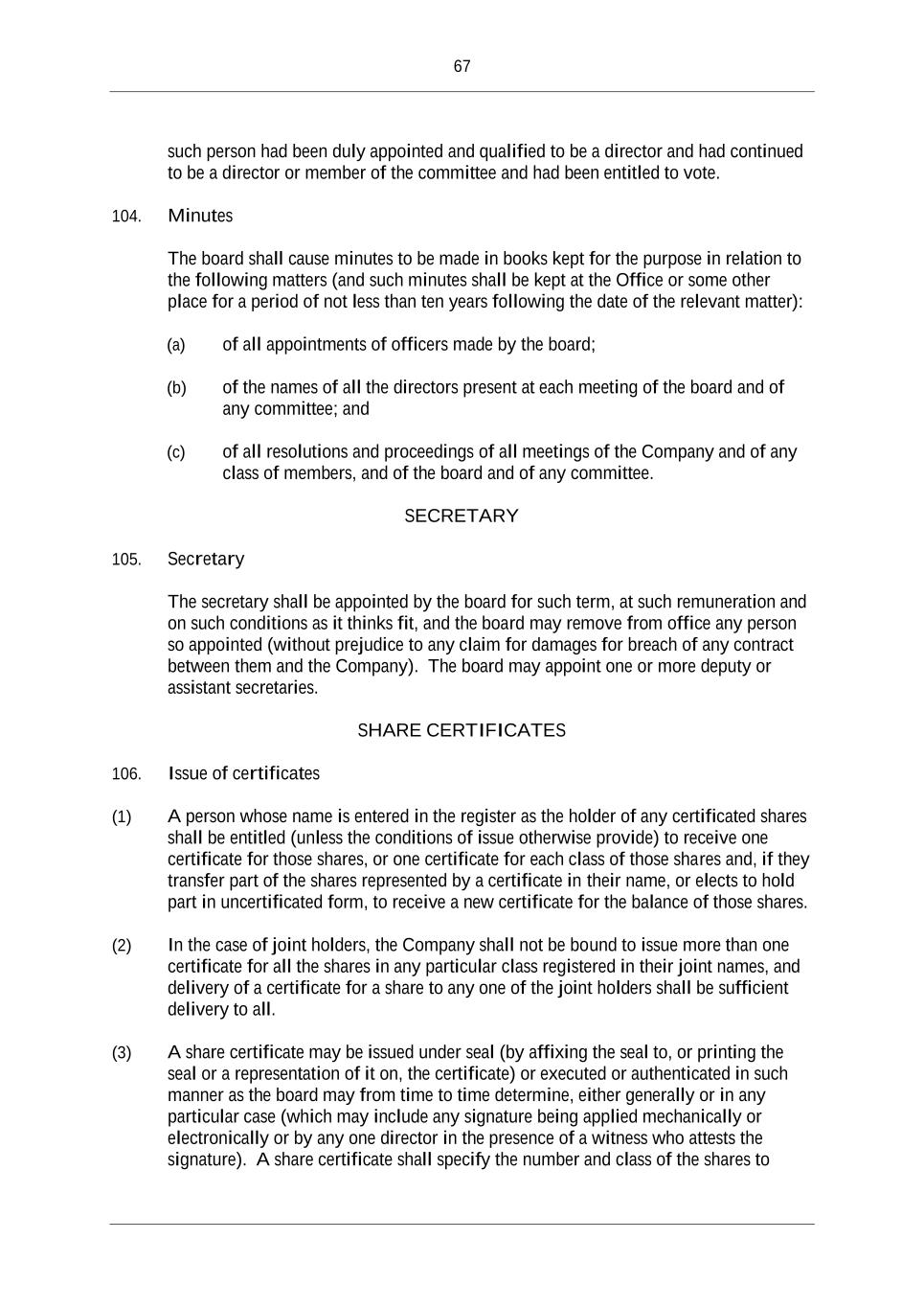 67 such person had been duly appointed and qualified to be a director and had continued to be a director or member of the committee and had been entitled to vote. 104. Minutes The board shall cause minutes to be made in books kept for the purpose in relation to the following matters (and such minutes shall be kept at the Office or some other place for a period of not less than ten years following the date of the relevant matter): (a) of all appointments of officers made by the board; (b) of the names of all the directors present at each meeting of the board and of any committee; and (c) of all resolutions and proceedings of all meetings of the Company and of any class of members, and of the board and of any committee. SECRETARY 105. Secretary The secretary shall be appointed by the board for such term, at such remuneration and on such conditions as it thinks fit, and the board may remove from office any person so appointed (without prejudice to any claim for damages for breach of any contract between them and the Company). The board may appoint one or more deputy or assistant secretaries. SHARE CERTIFICATES 106. Issue of certificates (1) A person whose name is entered in the register as the holder of any certificated shares shall be entitled (unless the conditions of issue otherwise provide) to receive one certificate for those shares, or one certificate for each class of those shares and, if they transfer part of the shares represented by a certificate in their name, or elects to hold part in uncertificated form, to receive a new certificate for the balance of those shares. (2) In the case of joint holders, the Company shall not be bound to issue more than one certificate for all the shares in any particular class registered in their joint names, and delivery of a certificate for a share to any one of the joint holders shall be sufficient delivery to all. (3) A share certificate may be issued under seal (by affixing the seal to, or printing the seal or a representation of it on, the certificate) or executed or authenticated in such manner as the board may from time to time determine, either generally or in any particular case (which may include any signature being applied mechanically or electronically or by any one director in the presence of a witness who attests the signature). A share certificate shall specify the number and class of the shares to