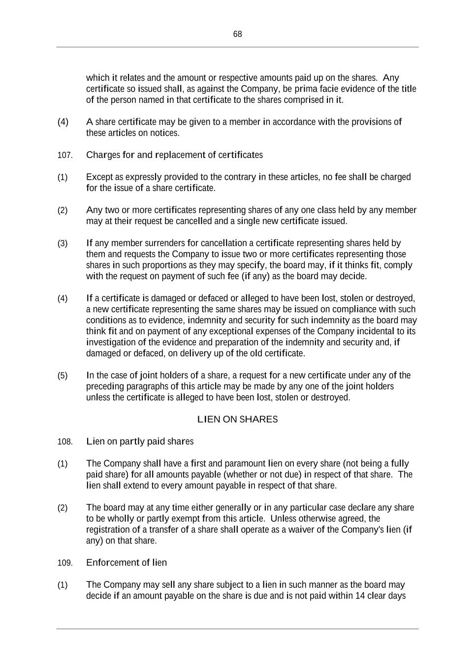 68 which it relates and the amount or respective amounts paid up on the shares. Any certificate so issued shall, as against the Company, be prima facie evidence of the title of the person named in that certificate to the shares comprised in it. (4) A share certificate may be given to a member in accordance with the provisions of these articles on notices. 107. Charges for and replacement of certificates (1) Except as expressly provided to the contrary in these articles, no fee shall be charged for the issue of a share certificate. (2) Any two or more certificates representing shares of any one class held by any member may at their request be cancelled and a single new certificate issued. (3) If any member surrenders for cancellation a certificate representing shares held by them and requests the Company to issue two or more certificates representing those shares in such proportions as they may specify, the board may, if it thinks fit, comply with the request on payment of such fee (if any) as the board may decide. (4) If a certificate is damaged or defaced or alleged to have been lost, stolen or destroyed, a new certificate representing the same shares may be issued on compliance with such conditions as to evidence, indemnity and security for such indemnity as the board may think fit and on payment of any exceptional expenses of the Company incidental to its investigation of the evidence and preparation of the indemnity and security and, if damaged or defaced, on delivery up of the old certificate. (5) In the case of joint holders of a share, a request for a new certificate under any of the preceding paragraphs of this article may be made by any one of the joint holders unless the certificate is alleged to have been lost, stolen or destroyed. LIEN ON SHARES 108. Lien on partly paid shares (1) The Company shall have a first and paramount lien on every share (not being a fully paid share) for all amounts payable (whether or not due) in respect of that share. The lien shall extend to every amount payable in respect of that share. (2) The board may at any time either generally or in any particular case declare any share to be wholly or partly exempt from this article. Unless otherwise agreed, the registration of a transfer of a share shall operate as a waiver of the Company's lien (if any) on that share. 109. Enforcement of lien (1) The Company may sell any share subject to a lien in such manner as the board may decide if an amount payable on the share is due and is not paid within 14 clear days