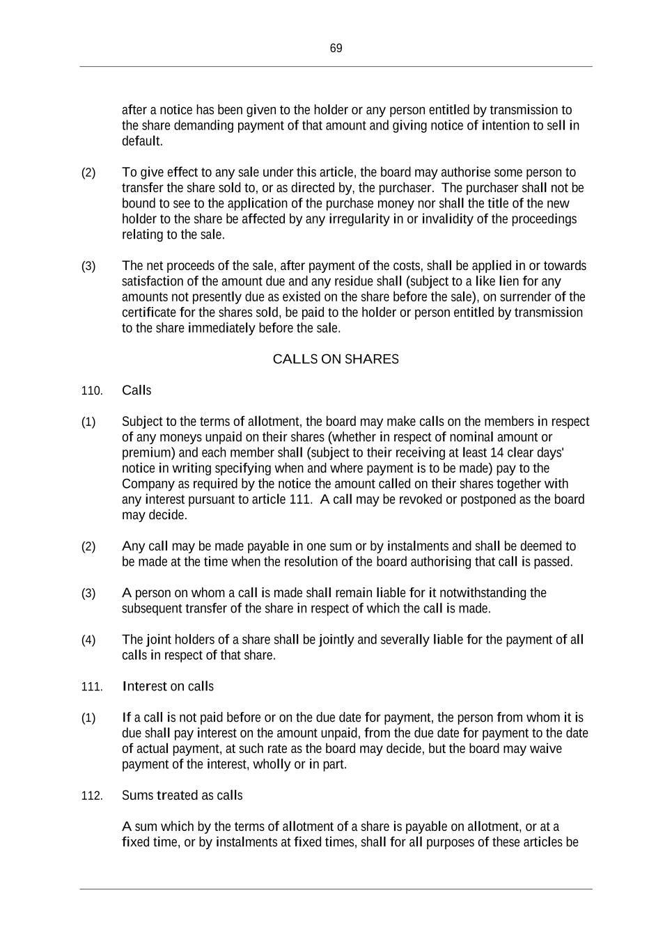 69 after a notice has been given to the holder or any person entitled by transmission to the share demanding payment of that amount and giving notice of intention to sell in default. (2) To give effect to any sale under this article, the board may authorise some person to transfer the share sold to, or as directed by, the purchaser. The purchaser shall not be bound to see to the application of the purchase money nor shall the title of the new holder to the share be affected by any irregularity in or invalidity of the proceedings relating to the sale. (3) The net proceeds of the sale, after payment of the costs, shall be applied in or towards satisfaction of the amount due and any residue shall (subject to a like lien for any amounts not presently due as existed on the share before the sale), on surrender of the certificate for the shares sold, be paid to the holder or person entitled by transmission to the share immediately before the sale. CALLS ON SHARES 110. Calls (1) Subject to the terms of allotment, the board may make calls on the members in respect of any moneys unpaid on their shares (whether in respect of nominal amount or premium) and each member shall (subject to their receiving at least 14 clear days' notice in writing specifying when and where payment is to be made) pay to the Company as required by the notice the amount called on their shares together with any interest pursuant to article 111. A call may be revoked or postponed as the board may decide. (2) Any call may be made payable in one sum or by instalments and shall be deemed to be made at the time when the resolution of the board authorising that call is passed. (3) A person on whom a call is made shall remain liable for it notwithstanding the subsequent transfer of the share in respect of which the call is made. (4) The joint holders of a share shall be jointly and severally liable for the payment of all calls in respect of that share. 111. Interest on calls (1) If a call is not paid before or on the due date for payment, the person from whom it is due shall pay interest on the amount unpaid, from the due date for payment to the date of actual payment, at such rate as the board may decide, but the board may waive payment of the interest, wholly or in part. 112. Sums treated as calls A sum which by the terms of allotment of a share is payable on allotment, or at a fixed time, or by instalments at fixed times, shall for all purposes of these articles be