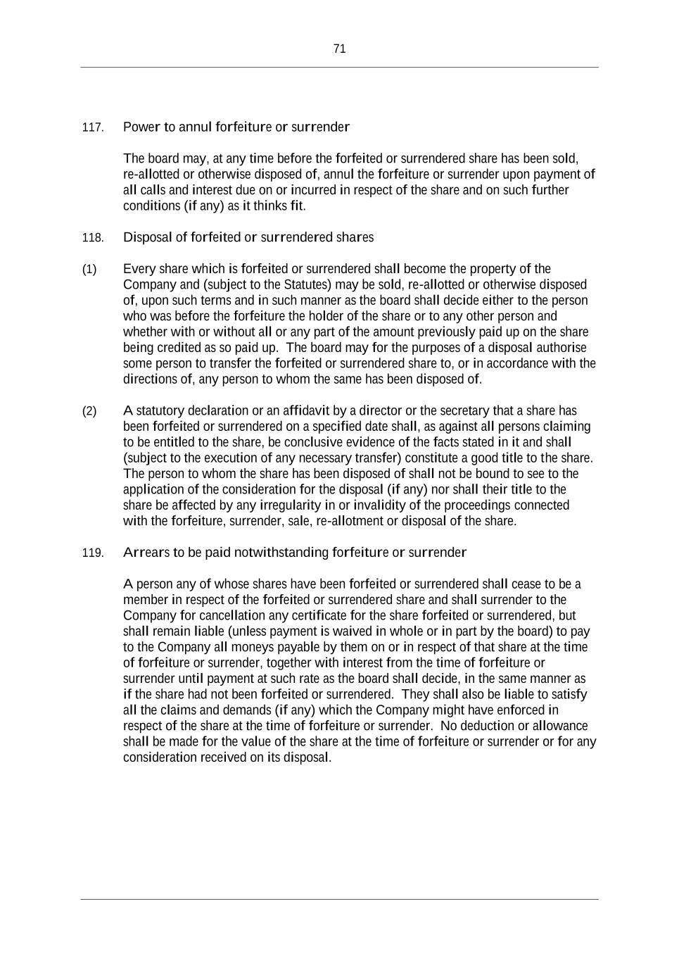 71 117. Power to annul forfeiture or surrender The board may, at any time before the forfeited or surrendered share has been sold, re-allotted or otherwise disposed of, annul the forfeiture or surrender upon payment of all calls and interest due on or incurred in respect of the share and on such further conditions (if any) as it thinks fit. 118. Disposal of forfeited or surrendered shares (1) Every share which is forfeited or surrendered shall become the property of the Company and (subject to the Statutes) may be sold, re-allotted or otherwise disposed of, upon such terms and in such manner as the board shall decide either to the person who was before the forfeiture the holder of the share or to any other person and whether with or without all or any part of the amount previously paid up on the share being credited as so paid up. The board may for the purposes of a disposal authorise some person to transfer the forfeited or surrendered share to, or in accordance with the directions of, any person to whom the same has been disposed of. (2) A statutory declaration or an affidavit by a director or the secretary that a share has been forfeited or surrendered on a specified date shall, as against all persons claiming to be entitled to the share, be conclusive evidence of the facts stated in it and shall (subject to the execution of any necessary transfer) constitute a good title to the share. The person to whom the share has been disposed of shall not be bound to see to the application of the consideration for the disposal (if any) nor shall their title to the share be affected by any irregularity in or invalidity of the proceedings connected with the forfeiture, surrender, sale, re-allotment or disposal of the share. 119. Arrears to be paid notwithstanding forfeiture or surrender A person any of whose shares have been forfeited or surrendered shall cease to be a member in respect of the forfeited or surrendered share and shall surrender to the Company for cancellation any certificate for the share forfeited or surrendered, but shall remain liable (unless payment is waived in whole or in part by the board) to pay to the Company all moneys payable by them on or in respect of that share at the time of forfeiture or surrender, together with interest from the time of forfeiture or surrender until payment at such rate as the board shall decide, in the same manner as if the share had not been forfeited or surrendered. They shall also be liable to satisfy all the claims and demands (if any) which the Company might have enforced in respect of the share at the time of forfeiture or surrender. No deduction or allowance shall be made for the value of the share at the time of forfeiture or surrender or for any consideration received on its disposal.