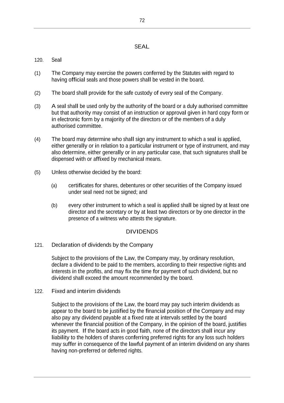72 SEAL 120. Seal (1) The Company may exercise the powers conferred by the Statutes with regard to having official seals and those powers shall be vested in the board. (2) The board shall provide for the safe custody of every seal of the Company. (3) A seal shall be used only by the authority of the board or a duly authorised committee but that authority may consist of an instruction or approval given in hard copy form or in electronic form by a majority of the directors or of the members of a duly authorised committee. (4) The board may determine who shall sign any instrument to which a seal is applied, either generally or in relation to a particular instrument or type of instrument, and may also determine, either generally or in any particular case, that such signatures shall be dispensed with or affixed by mechanical means. (5) Unless otherwise decided by the board: (a) certificates for shares, debentures or other securities of the Company issued under seal need not be signed; and (b) every other instrument to which a seal is applied shall be signed by at least one director and the secretary or by at least two directors or by one director in the presence of a witness who attests the signature. DIVIDENDS 121. Declaration of dividends by the Company Subject to the provisions of the Law, the Company may, by ordinary resolution, declare a dividend to be paid to the members, according to their respective rights and interests in the profits, and may fix the time for payment of such dividend, but no dividend shall exceed the amount recommended by the board. 122. Fixed and interim dividends Subject to the provisions of the Law, the board may pay such interim dividends as appear to the board to be justified by the financial position of the Company and may also pay any dividend payable at a fixed rate at intervals settled by the board whenever the financial position of the Company, in the opinion of the board, justifies its payment. If the board acts in good faith, none of the directors shall incur any liability to the holders of shares conferring preferred rights for any loss such holders may suffer in consequence of the lawful payment of an interim dividend on any shares having non-preferred or deferred rights.
