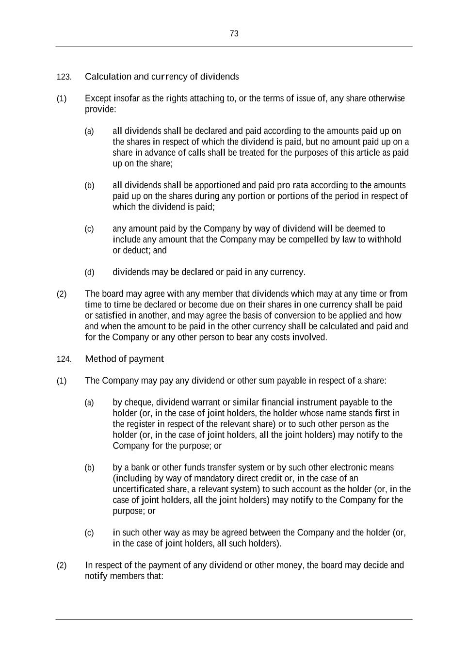 73 123. Calculation and currency of dividends (1) Except insofar as the rights attaching to, or the terms of issue of, any share otherwise provide: (a) all dividends shall be declared and paid according to the amounts paid up on the shares in respect of which the dividend is paid, but no amount paid up on a share in advance of calls shall be treated for the purposes of this article as paid up on the share; (b) all dividends shall be apportioned and paid pro rata according to the amounts paid up on the shares during any portion or portions of the period in respect of which the dividend is paid; (c) any amount paid by the Company by way of dividend will be deemed to include any amount that the Company may be compelled by law to withhold or deduct; and (d) dividends may be declared or paid in any currency. (2) The board may agree with any member that dividends which may at any time or from time to time be declared or become due on their shares in one currency shall be paid or satisfied in another, and may agree the basis of conversion to be applied and how and when the amount to be paid in the other currency shall be calculated and paid and for the Company or any other person to bear any costs involved. 124. Method of payment (1) The Company may pay any dividend or other sum payable in respect of a share: (a) by cheque, dividend warrant or similar financial instrument payable to the holder (or, in the case of joint holders, the holder whose name stands first in the register in respect of the relevant share) or to such other person as the holder (or, in the case of joint holders, all the joint holders) may notify to the Company for the purpose; or (b) by a bank or other funds transfer system or by such other electronic means (including by way of mandatory direct credit or, in the case of an uncertificated share, a relevant system) to such account as the holder (or, in the case of joint holders, all the joint holders) may notify to the Company for the purpose; or (c) in such other way as may be agreed between the Company and the holder (or, in the case of joint holders, all such holders). (2) In respect of the payment of any dividend or other money, the board may decide and notify members that: