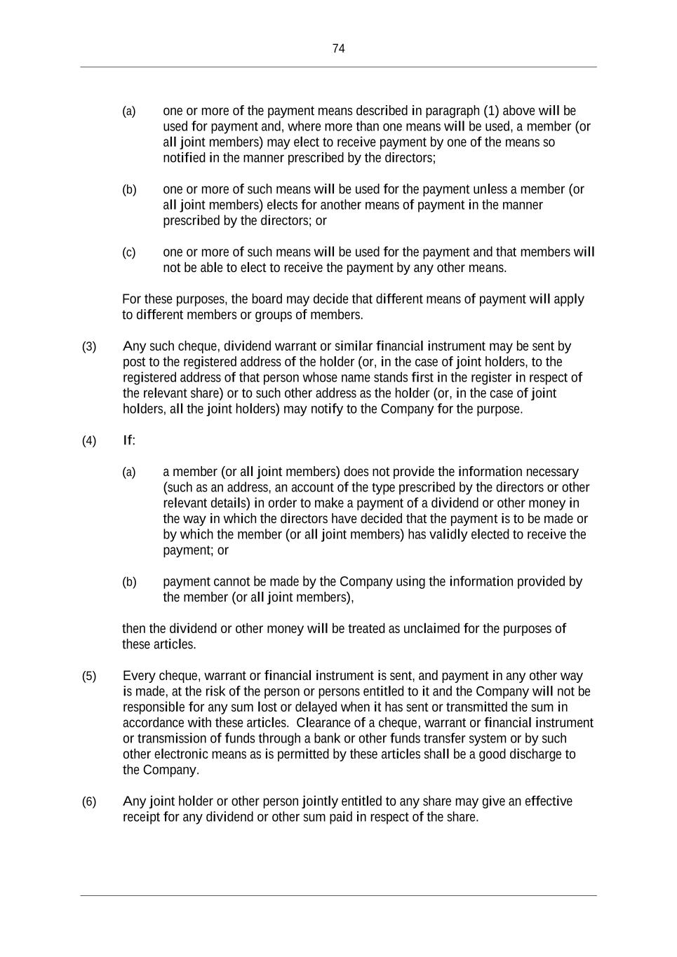 74 (a) one or more of the payment means described in paragraph (1) above will be used for payment and, where more than one means will be used, a member (or all joint members) may elect to receive payment by one of the means so notified in the manner prescribed by the directors; (b) one or more of such means will be used for the payment unless a member (or all joint members) elects for another means of payment in the manner prescribed by the directors; or (c) one or more of such means will be used for the payment and that members will not be able to elect to receive the payment by any other means. For these purposes, the board may decide that different means of payment will apply to different members or groups of members. (3) Any such cheque, dividend warrant or similar financial instrument may be sent by post to the registered address of the holder (or, in the case of joint holders, to the registered address of that person whose name stands first in the register in respect of the relevant share) or to such other address as the holder (or, in the case of joint holders, all the joint holders) may notify to the Company for the purpose. (4) If: (a) a member (or all joint members) does not provide the information necessary (such as an address, an account of the type prescribed by the directors or other relevant details) in order to make a payment of a dividend or other money in the way in which the directors have decided that the payment is to be made or by which the member (or all joint members) has validly elected to receive the payment; or (b) payment cannot be made by the Company using the information provided by the member (or all joint members), then the dividend or other money will be treated as unclaimed for the purposes of these articles. (5) Every cheque, warrant or financial instrument is sent, and payment in any other way is made, at the risk of the person or persons entitled to it and the Company will not be responsible for any sum lost or delayed when it has sent or transmitted the sum in accordance with these articles. Clearance of a cheque, warrant or financial instrument or transmission of funds through a bank or other funds transfer system or by such other electronic means as is permitted by these articles shall be a good discharge to the Company. (6) Any joint holder or other person jointly entitled to any share may give an effective receipt for any dividend or other sum paid in respect of the share.