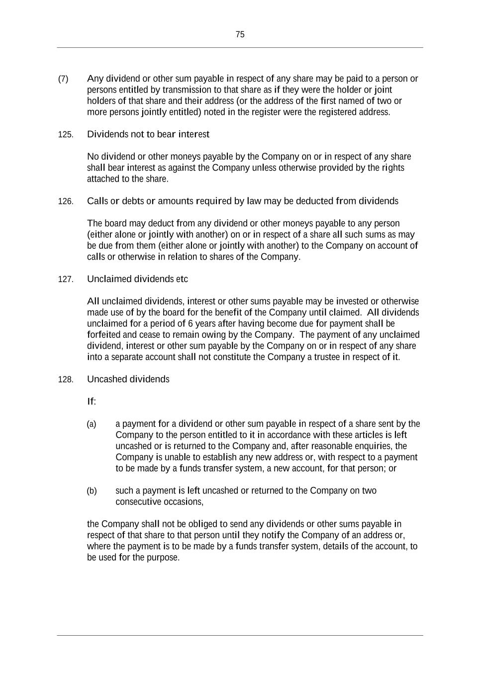 75 (7) Any dividend or other sum payable in respect of any share may be paid to a person or persons entitled by transmission to that share as if they were the holder or joint holders of that share and their address (or the address of the first named of two or more persons jointly entitled) noted in the register were the registered address. 125. Dividends not to bear interest No dividend or other moneys payable by the Company on or in respect of any share shall bear interest as against the Company unless otherwise provided by the rights attached to the share. 126. Calls or debts or amounts required by law may be deducted from dividends The board may deduct from any dividend or other moneys payable to any person (either alone or jointly with another) on or in respect of a share all such sums as may be due from them (either alone or jointly with another) to the Company on account of calls or otherwise in relation to shares of the Company. 127. Unclaimed dividends etc All unclaimed dividends, interest or other sums payable may be invested or otherwise made use of by the board for the benefit of the Company until claimed. All dividends unclaimed for a period of 6 years after having become due for payment shall be forfeited and cease to remain owing by the Company. The payment of any unclaimed dividend, interest or other sum payable by the Company on or in respect of any share into a separate account shall not constitute the Company a trustee in respect of it. 128. Uncashed dividends If: (a) a payment for a dividend or other sum payable in respect of a share sent by the Company to the person entitled to it in accordance with these articles is left uncashed or is returned to the Company and, after reasonable enquiries, the Company is unable to establish any new address or, with respect to a payment to be made by a funds transfer system, a new account, for that person; or (b) such a payment is left uncashed or returned to the Company on two consecutive occasions, the Company shall not be obliged to send any dividends or other sums payable in respect of that share to that person until they notify the Company of an address or, where the payment is to be made by a funds transfer system, details of the account, to be used for the purpose.