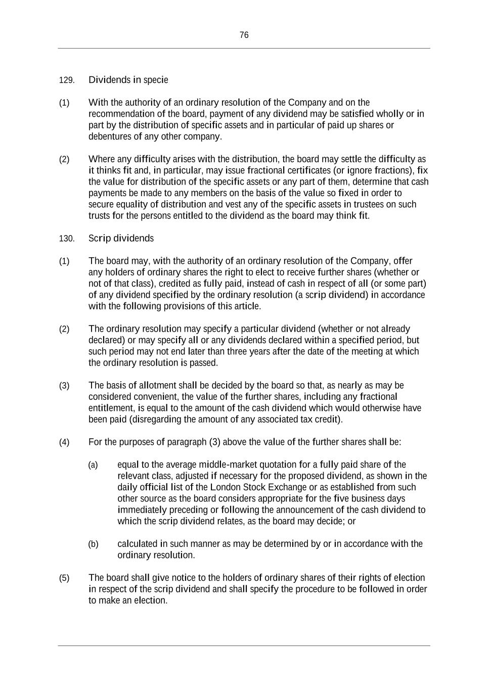 76 129. Dividends in specie (1) With the authority of an ordinary resolution of the Company and on the recommendation of the board, payment of any dividend may be satisfied wholly or in part by the distribution of specific assets and in particular of paid up shares or debentures of any other company. (2) Where any difficulty arises with the distribution, the board may settle the difficulty as it thinks fit and, in particular, may issue fractional certificates (or ignore fractions), fix the value for distribution of the specific assets or any part of them, determine that cash payments be made to any members on the basis of the value so fixed in order to secure equality of distribution and vest any of the specific assets in trustees on such trusts for the persons entitled to the dividend as the board may think fit. 130. Scrip dividends (1) The board may, with the authority of an ordinary resolution of the Company, offer any holders of ordinary shares the right to elect to receive further shares (whether or not of that class), credited as fully paid, instead of cash in respect of all (or some part) of any dividend specified by the ordinary resolution (a scrip dividend) in accordance with the following provisions of this article. (2) The ordinary resolution may specify a particular dividend (whether or not already declared) or may specify all or any dividends declared within a specified period, but such period may not end later than three years after the date of the meeting at which the ordinary resolution is passed. (3) The basis of allotment shall be decided by the board so that, as nearly as may be considered convenient, the value of the further shares, including any fractional entitlement, is equal to the amount of the cash dividend which would otherwise have been paid (disregarding the amount of any associated tax credit). (4) For the purposes of paragraph (3) above the value of the further shares shall be: (a) equal to the average middle-market quotation for a fully paid share of the relevant class, adjusted if necessary for the proposed dividend, as shown in the daily official list of the London Stock Exchange or as established from such other source as the board considers appropriate for the five business days immediately preceding or following the announcement of the cash dividend to which the scrip dividend relates, as the board may decide; or (b) calculated in such manner as may be determined by or in accordance with the ordinary resolution. (5) The board shall give notice to the holders of ordinary shares of their rights of election in respect of the scrip dividend and shall specify the procedure to be followed in order to make an election.