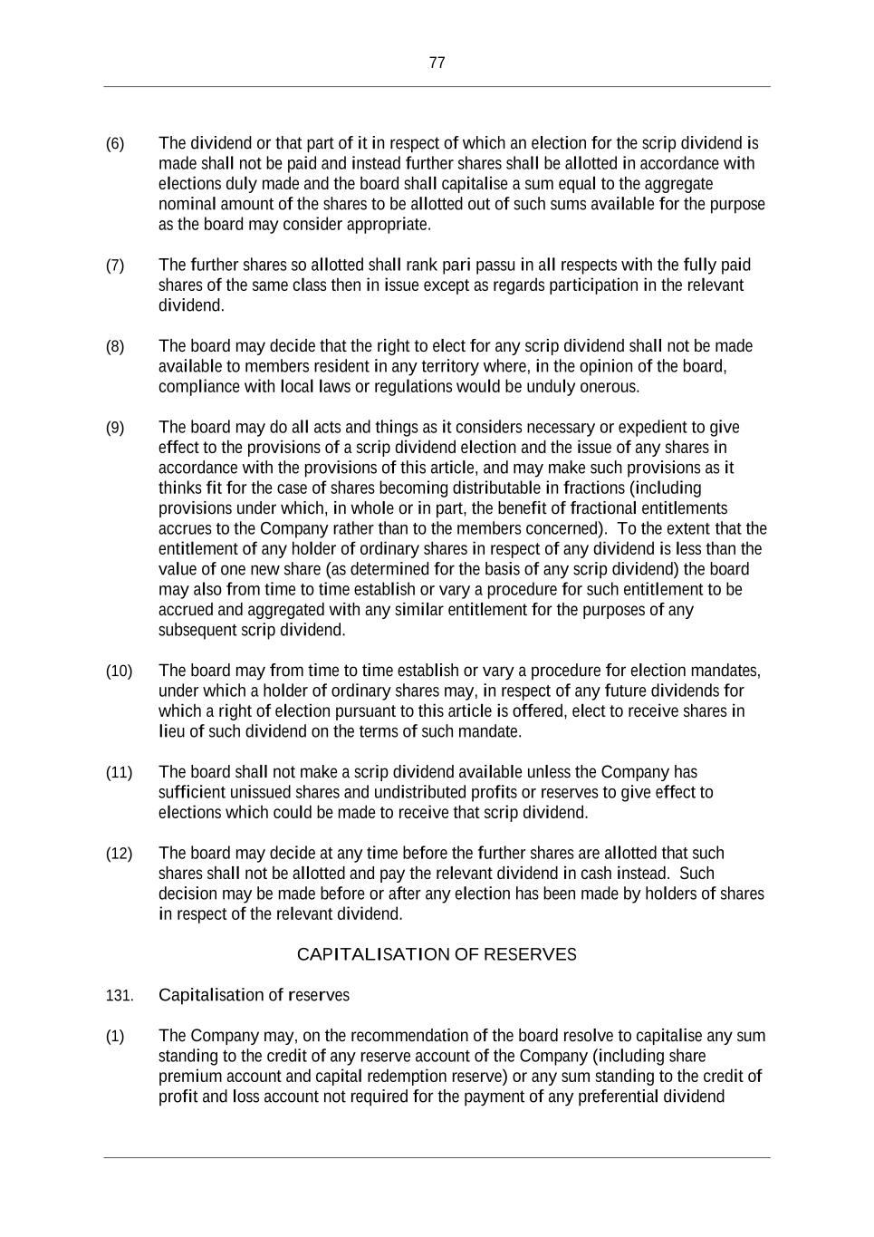 77 (6) The dividend or that part of it in respect of which an election for the scrip dividend is made shall not be paid and instead further shares shall be allotted in accordance with elections duly made and the board shall capitalise a sum equal to the aggregate nominal amount of the shares to be allotted out of such sums available for the purpose as the board may consider appropriate. (7) The further shares so allotted shall rank pari passu in all respects with the fully paid shares of the same class then in issue except as regards participation in the relevant dividend. (8) The board may decide that the right to elect for any scrip dividend shall not be made available to members resident in any territory where, in the opinion of the board, compliance with local laws or regulations would be unduly onerous. (9) The board may do all acts and things as it considers necessary or expedient to give effect to the provisions of a scrip dividend election and the issue of any shares in accordance with the provisions of this article, and may make such provisions as it thinks fit for the case of shares becoming distributable in fractions (including provisions under which, in whole or in part, the benefit of fractional entitlements accrues to the Company rather than to the members concerned). To the extent that the entitlement of any holder of ordinary shares in respect of any dividend is less than the value of one new share (as determined for the basis of any scrip dividend) the board may also from time to time establish or vary a procedure for such entitlement to be accrued and aggregated with any similar entitlement for the purposes of any subsequent scrip dividend. (10) The board may from time to time establish or vary a procedure for election mandates, under which a holder of ordinary shares may, in respect of any future dividends for which a right of election pursuant to this article is offered, elect to receive shares in lieu of such dividend on the terms of such mandate. (11) The board shall not make a scrip dividend available unless the Company has sufficient unissued shares and undistributed profits or reserves to give effect to elections which could be made to receive that scrip dividend. (12) The board may decide at any time before the further shares are allotted that such shares shall not be allotted and pay the relevant dividend in cash instead. Such decision may be made before or after any election has been made by holders of shares in respect of the relevant dividend. CAPITALISATION OF RESERVES 131. Capitalisation of reserves (1) The Company may, on the recommendation of the board resolve to capitalise any sum standing to the credit of any reserve account of the Company (including share premium account and capital redemption reserve) or any sum standing to the credit of profit and loss account not required for the payment of any preferential dividend