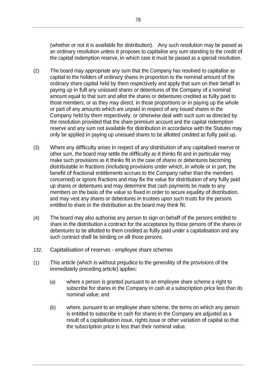 78 (whether or not it is available for distribution). Any such resolution may be passed as an ordinary resolution unless it proposes to capitalise any sum standing to the credit of the capital redemption reserve, in which case it must be passed as a special resolution. (2) The board may appropriate any sum that the Company has resolved to capitalise as capital to the holders of ordinary shares in proportion to the nominal amount of the ordinary share capital held by them respectively and apply that sum on their behalf in paying up in full any unissued shares or debentures of the Company of a nominal amount equal to that sum and allot the shares or debentures credited as fully paid to those members, or as they may direct, in those proportions or in paying up the whole or part of any amounts which are unpaid in respect of any issued shares in the Company held by them respectively, or otherwise deal with such sum as directed by the resolution provided that the share premium account and the capital redemption reserve and any sum not available for distribution in accordance with the Statutes may only be applied in paying up unissued shares to be allotted credited as fully paid up. (3) Where any difficulty arises in respect of any distribution of any capitalised reserve or other sum, the board may settle the difficulty as it thinks fit and in particular may make such provisions as it thinks fit in the case of shares or debentures becoming distributable in fractions (including provisions under which, in whole or in part, the benefit of fractional entitlements accrues to the Company rather than the members concerned) or ignore fractions and may fix the value for distribution of any fully paid up shares or debentures and may determine that cash payments be made to any members on the basis of the value so fixed in order to secure equality of distribution, and may vest any shares or debentures in trustees upon such trusts for the persons entitled to share in the distribution as the board may think fit. (4) The board may also authorise any person to sign on behalf of the persons entitled to share in the distribution a contract for the acceptance by those persons of the shares or debentures to be allotted to them credited as fully paid under a capitalisation and any such contract shall be binding on all those persons. 132. Capitalisation of reserves - employee share schemes (1) This article (which is without prejudice to the generality of the provisions of the immediately preceding article) applies: (a) where a person is granted pursuant to an employee share scheme a right to subscribe for shares in the Company in cash at a subscription price less than its nominal value; and (b) where, pursuant to an employee share scheme, the terms on which any person is entitled to subscribe in cash for shares in the Company are adjusted as a result of a capitalisation issue, rights issue or other variation of capital so that the subscription price is less than their nominal value.
