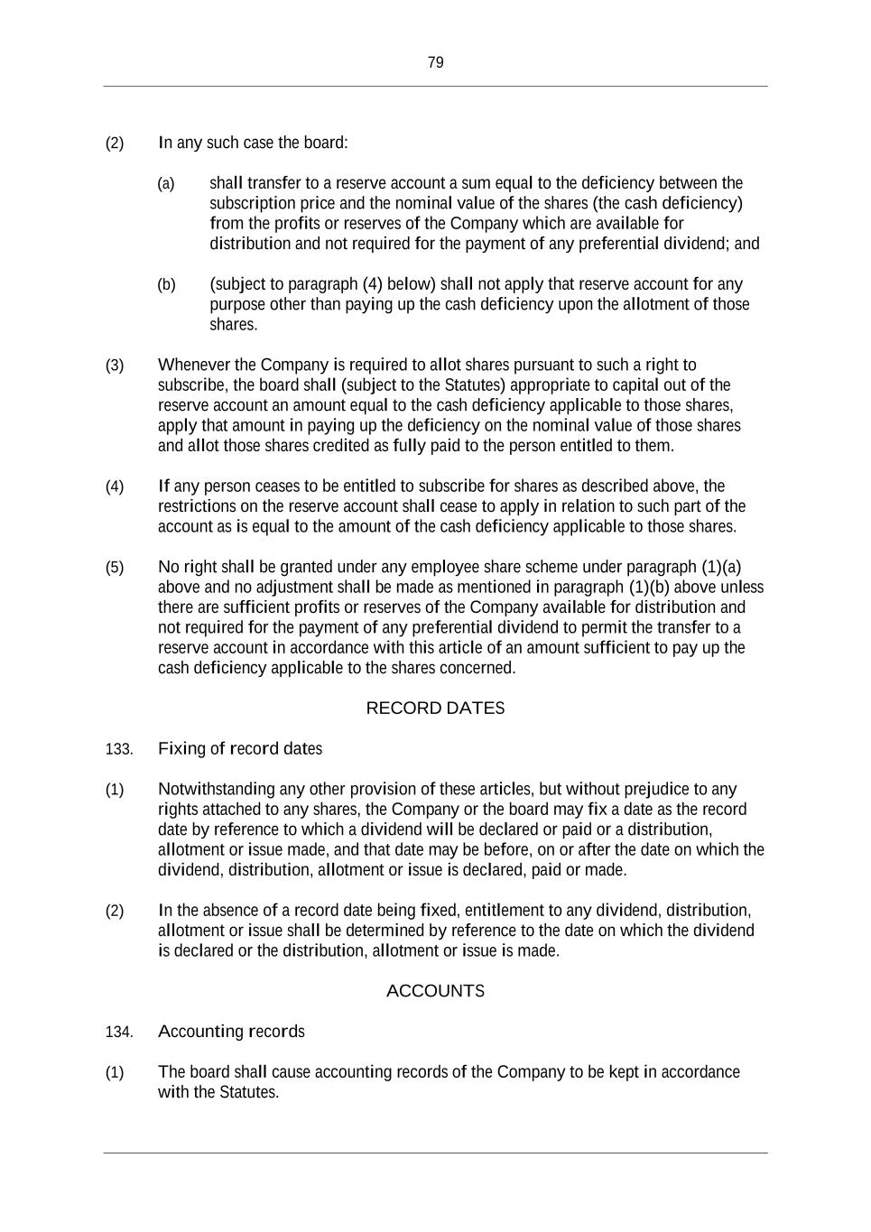 79 (2) In any such case the board: (a) shall transfer to a reserve account a sum equal to the deficiency between the subscription price and the nominal value of the shares (the cash deficiency) from the profits or reserves of the Company which are available for distribution and not required for the payment of any preferential dividend; and (b) (subject to paragraph (4) below) shall not apply that reserve account for any purpose other than paying up the cash deficiency upon the allotment of those shares. (3) Whenever the Company is required to allot shares pursuant to such a right to subscribe, the board shall (subject to the Statutes) appropriate to capital out of the reserve account an amount equal to the cash deficiency applicable to those shares, apply that amount in paying up the deficiency on the nominal value of those shares and allot those shares credited as fully paid to the person entitled to them. (4) If any person ceases to be entitled to subscribe for shares as described above, the restrictions on the reserve account shall cease to apply in relation to such part of the account as is equal to the amount of the cash deficiency applicable to those shares. (5) No right shall be granted under any employee share scheme under paragraph (1)(a) above and no adjustment shall be made as mentioned in paragraph (1)(b) above unless there are sufficient profits or reserves of the Company available for distribution and not required for the payment of any preferential dividend to permit the transfer to a reserve account in accordance with this article of an amount sufficient to pay up the cash deficiency applicable to the shares concerned. RECORD DATES 133. Fixing of record dates (1) Notwithstanding any other provision of these articles, but without prejudice to any rights attached to any shares, the Company or the board may fix a date as the record date by reference to which a dividend will be declared or paid or a distribution, allotment or issue made, and that date may be before, on or after the date on which the dividend, distribution, allotment or issue is declared, paid or made. (2) In the absence of a record date being fixed, entitlement to any dividend, distribution, allotment or issue shall be determined by reference to the date on which the dividend is declared or the distribution, allotment or issue is made. ACCOUNTS 134. Accounting records (1) The board shall cause accounting records of the Company to be kept in accordance with the Statutes.