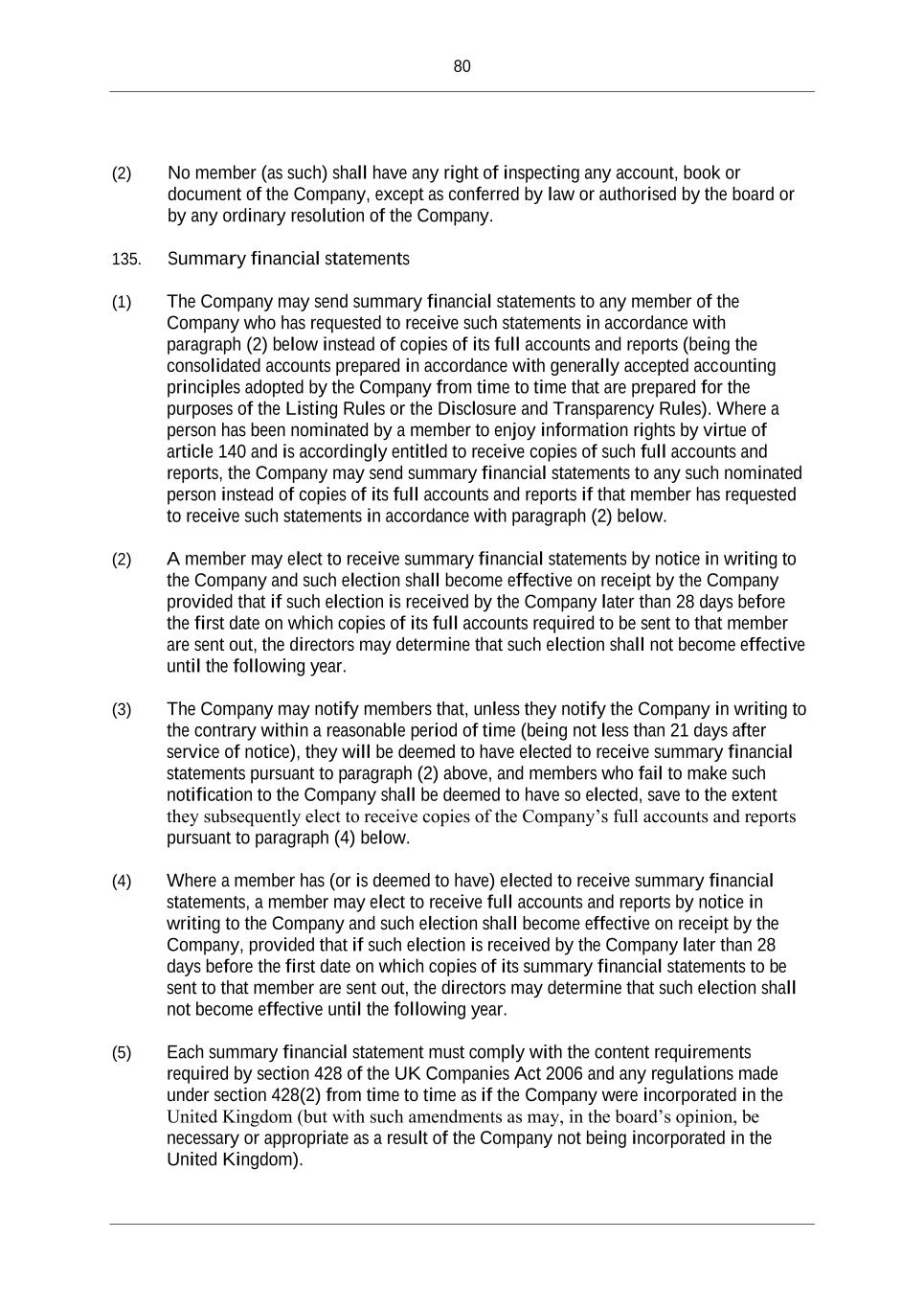 80 (2) No member (as such) shall have any right of inspecting any account, book or document of the Company, except as conferred by law or authorised by the board or by any ordinary resolution of the Company. 135. Summary financial statements (1) The Company may send summary financial statements to any member of the Company who has requested to receive such statements in accordance with paragraph (2) below instead of copies of its full accounts and reports (being the consolidated accounts prepared in accordance with generally accepted accounting principles adopted by the Company from time to time that are prepared for the purposes of the Listing Rules or the Disclosure and Transparency Rules). Where a person has been nominated by a member to enjoy information rights by virtue of article 140 and is accordingly entitled to receive copies of such full accounts and reports, the Company may send summary financial statements to any such nominated person instead of copies of its full accounts and reports if that member has requested to receive such statements in accordance with paragraph (2) below. (2) A member may elect to receive summary financial statements by notice in writing to the Company and such election shall become effective on receipt by the Company provided that if such election is received by the Company later than 28 days before the first date on which copies of its full accounts required to be sent to that member are sent out, the directors may determine that such election shall not become effective until the following year. (3) The Company may notify members that, unless they notify the Company in writing to the contrary within a reasonable period of time (being not less than 21 days after service of notice), they will be deemed to have elected to receive summary financial statements pursuant to paragraph (2) above, and members who fail to make such notification to the Company shall be deemed to have so elected, save to the extent they subsequently elect to receive copies of the Company’s full accounts and reports pursuant to paragraph (4) below. (4) Where a member has (or is deemed to have) elected to receive summary financial statements, a member may elect to receive full accounts and reports by notice in writing to the Company and such election shall become effective on receipt by the Company, provided that if such election is received by the Company later than 28 days before the first date on which copies of its summary financial statements to be sent to that member are sent out, the directors may determine that such election shall not become effective until the following year. (5) Each summary financial statement must comply with the content requirements required by section 428 of the UK Companies Act 2006 and any regulations made under section 428(2) from time to time as if the Company were incorporated in the United Kingdom (but with such amendments as may, in the board’s opinion, be necessary or appropriate as a result of the Company not being incorporated in the United Kingdom).