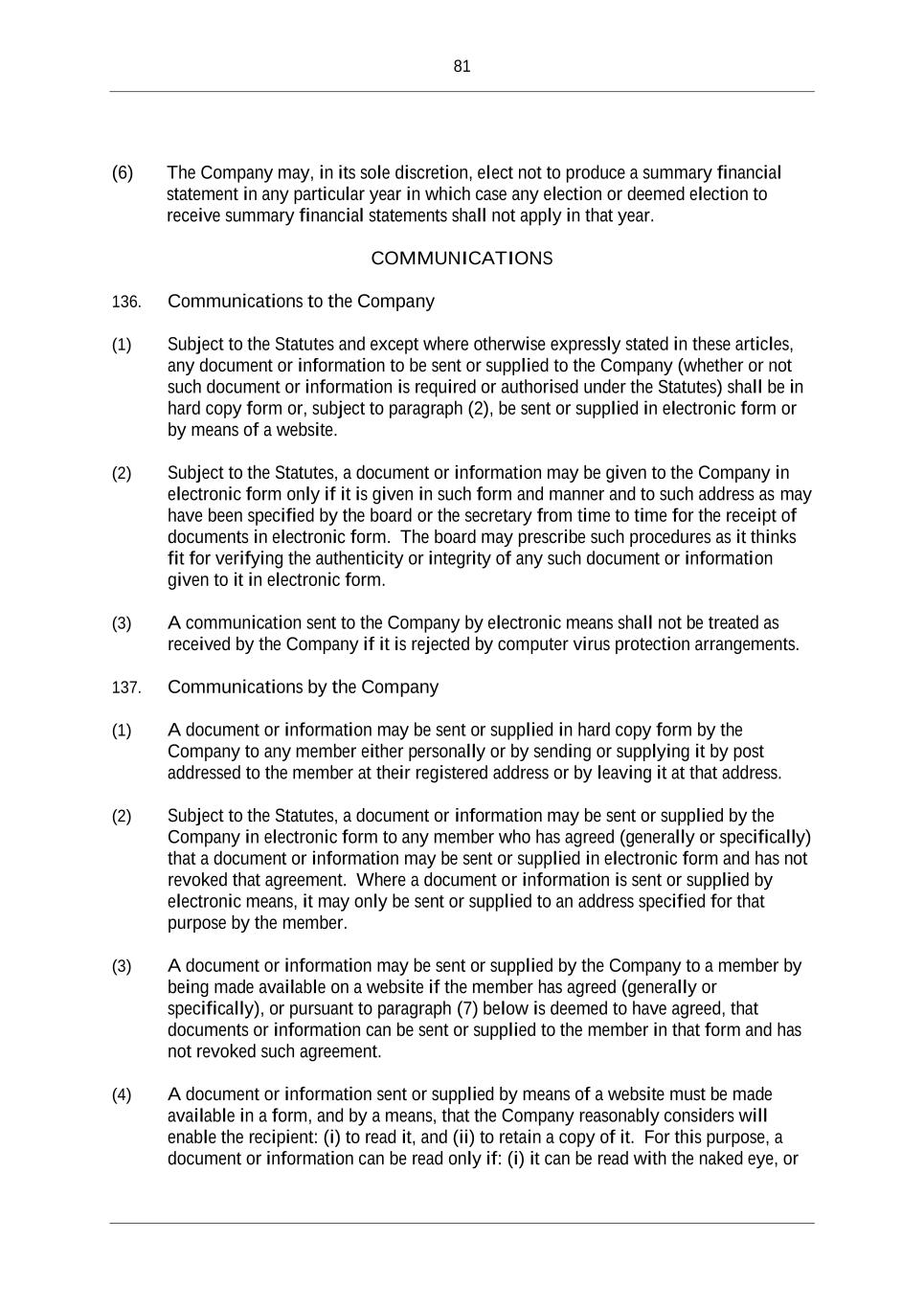 81 (6) The Company may, in its sole discretion, elect not to produce a summary financial statement in any particular year in which case any election or deemed election to receive summary financial statements shall not apply in that year. COMMUNICATIONS 136. Communications to the Company (1) Subject to the Statutes and except where otherwise expressly stated in these articles, any document or information to be sent or supplied to the Company (whether or not such document or information is required or authorised under the Statutes) shall be in hard copy form or, subject to paragraph (2), be sent or supplied in electronic form or by means of a website. (2) Subject to the Statutes, a document or information may be given to the Company in electronic form only if it is given in such form and manner and to such address as may have been specified by the board or the secretary from time to time for the receipt of documents in electronic form. The board may prescribe such procedures as it thinks fit for verifying the authenticity or integrity of any such document or information given to it in electronic form. (3) A communication sent to the Company by electronic means shall not be treated as received by the Company if it is rejected by computer virus protection arrangements. 137. Communications by the Company (1) A document or information may be sent or supplied in hard copy form by the Company to any member either personally or by sending or supplying it by post addressed to the member at their registered address or by leaving it at that address. (2) Subject to the Statutes, a document or information may be sent or supplied by the Company in electronic form to any member who has agreed (generally or specifically) that a document or information may be sent or supplied in electronic form and has not revoked that agreement. Where a document or information is sent or supplied by electronic means, it may only be sent or supplied to an address specified for that purpose by the member. (3) A document or information may be sent or supplied by the Company to a member by being made available on a website if the member has agreed (generally or specifically), or pursuant to paragraph (7) below is deemed to have agreed, that documents or information can be sent or supplied to the member in that form and has not revoked such agreement. (4) A document or information sent or supplied by means of a website must be made available in a form, and by a means, that the Company reasonably considers will enable the recipient: (i) to read it, and (ii) to retain a copy of it. For this purpose, a document or information can be read only if: (i) it can be read with the naked eye, or