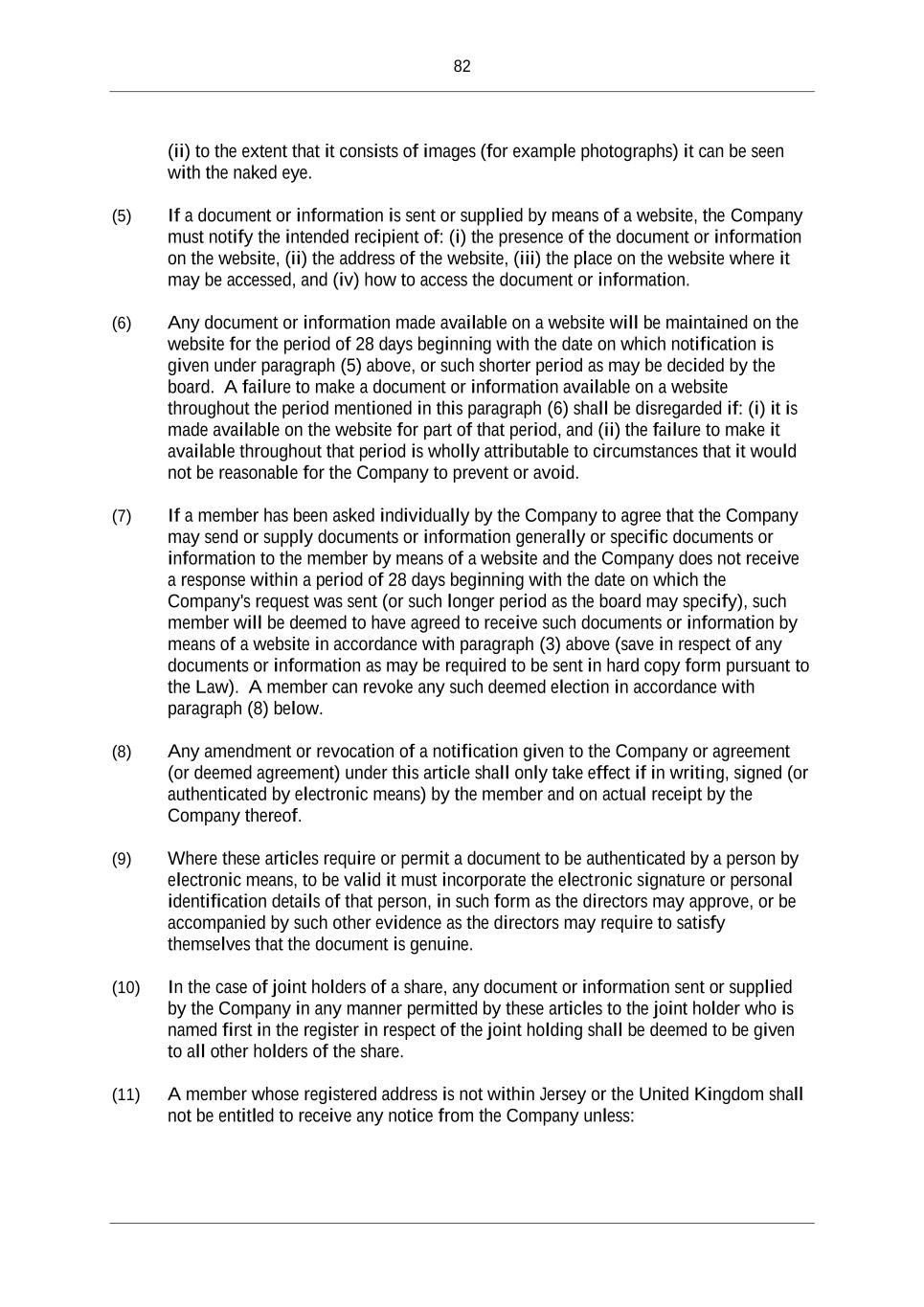 82 (ii) to the extent that it consists of images (for example photographs) it can be seen with the naked eye. (5) If a document or information is sent or supplied by means of a website, the Company must notify the intended recipient of: (i) the presence of the document or information on the website, (ii) the address of the website, (iii) the place on the website where it may be accessed, and (iv) how to access the document or information. (6) Any document or information made available on a website will be maintained on the website for the period of 28 days beginning with the date on which notification is given under paragraph (5) above, or such shorter period as may be decided by the board. A failure to make a document or information available on a website throughout the period mentioned in this paragraph (6) shall be disregarded if: (i) it is made available on the website for part of that period, and (ii) the failure to make it available throughout that period is wholly attributable to circumstances that it would not be reasonable for the Company to prevent or avoid. (7) If a member has been asked individually by the Company to agree that the Company may send or supply documents or information generally or specific documents or information to the member by means of a website and the Company does not receive a response within a period of 28 days beginning with the date on which the Company's request was sent (or such longer period as the board may specify), such member will be deemed to have agreed to receive such documents or information by means of a website in accordance with paragraph (3) above (save in respect of any documents or information as may be required to be sent in hard copy form pursuant to the Law). A member can revoke any such deemed election in accordance with paragraph (8) below. (8) Any amendment or revocation of a notification given to the Company or agreement (or deemed agreement) under this article shall only take effect if in writing, signed (or authenticated by electronic means) by the member and on actual receipt by the Company thereof. (9) Where these articles require or permit a document to be authenticated by a person by electronic means, to be valid it must incorporate the electronic signature or personal identification details of that person, in such form as the directors may approve, or be accompanied by such other evidence as the directors may require to satisfy themselves that the document is genuine. (10) In the case of joint holders of a share, any document or information sent or supplied by the Company in any manner permitted by these articles to the joint holder who is named first in the register in respect of the joint holding shall be deemed to be given to all other holders of the share. (11) A member whose registered address is not within Jersey or the United Kingdom shall not be entitled to receive any notice from the Company unless:
