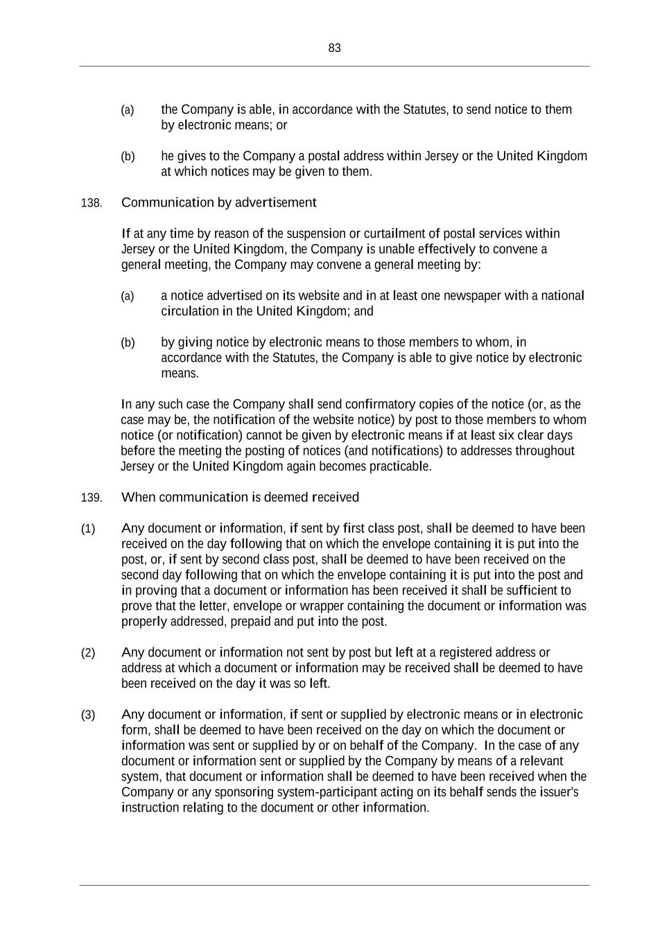 83 (a) the Company is able, in accordance with the Statutes, to send notice to them by electronic means; or (b) he gives to the Company a postal address within Jersey or the United Kingdom at which notices may be given to them. 138. Communication by advertisement If at any time by reason of the suspension or curtailment of postal services within Jersey or the United Kingdom, the Company is unable effectively to convene a general meeting, the Company may convene a general meeting by: (a) a notice advertised on its website and in at least one newspaper with a national circulation in the United Kingdom; and (b) by giving notice by electronic means to those members to whom, in accordance with the Statutes, the Company is able to give notice by electronic means. In any such case the Company shall send confirmatory copies of the notice (or, as the case may be, the notification of the website notice) by post to those members to whom notice (or notification) cannot be given by electronic means if at least six clear days before the meeting the posting of notices (and notifications) to addresses throughout Jersey or the United Kingdom again becomes practicable. 139. When communication is deemed received (1) Any document or information, if sent by first class post, shall be deemed to have been received on the day following that on which the envelope containing it is put into the post, or, if sent by second class post, shall be deemed to have been received on the second day following that on which the envelope containing it is put into the post and in proving that a document or information has been received it shall be sufficient to prove that the letter, envelope or wrapper containing the document or information was properly addressed, prepaid and put into the post. (2) Any document or information not sent by post but left at a registered address or address at which a document or information may be received shall be deemed to have been received on the day it was so left. (3) Any document or information, if sent or supplied by electronic means or in electronic form, shall be deemed to have been received on the day on which the document or information was sent or supplied by or on behalf of the Company. In the case of any document or information sent or supplied by the Company by means of a relevant system, that document or information shall be deemed to have been received when the Company or any sponsoring system-participant acting on its behalf sends the issuer's instruction relating to the document or other information.