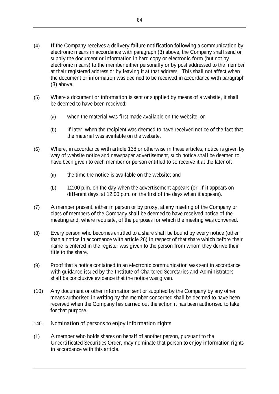 84 (4) If the Company receives a delivery failure notification following a communication by electronic means in accordance with paragraph (3) above, the Company shall send or supply the document or information in hard copy or electronic form (but not by electronic means) to the member either personally or by post addressed to the member at their registered address or by leaving it at that address. This shall not affect when the document or information was deemed to be received in accordance with paragraph (3) above. (5) Where a document or information is sent or supplied by means of a website, it shall be deemed to have been received: (a) when the material was first made available on the website; or (b) if later, when the recipient was deemed to have received notice of the fact that the material was available on the website. (6) Where, in accordance with article 138 or otherwise in these articles, notice is given by way of website notice and newspaper advertisement, such notice shall be deemed to have been given to each member or person entitled to so receive it at the later of: (a) the time the notice is available on the website; and (b) 12.00 p.m. on the day when the advertisement appears (or, if it appears on different days, at 12.00 p.m. on the first of the days when it appears). (7) A member present, either in person or by proxy, at any meeting of the Company or class of members of the Company shall be deemed to have received notice of the meeting and, where requisite, of the purposes for which the meeting was convened. (8) Every person who becomes entitled to a share shall be bound by every notice (other than a notice in accordance with article 26) in respect of that share which before their name is entered in the register was given to the person from whom they derive their title to the share. (9) Proof that a notice contained in an electronic communication was sent in accordance with guidance issued by the Institute of Chartered Secretaries and Administrators shall be conclusive evidence that the notice was given. (10) Any document or other information sent or supplied by the Company by any other means authorised in writing by the member concerned shall be deemed to have been received when the Company has carried out the action it has been authorised to take for that purpose. 140. Nomination of persons to enjoy information rights (1) A member who holds shares on behalf of another person, pursuant to the Uncertificated Securities Order, may nominate that person to enjoy information rights in accordance with this article.