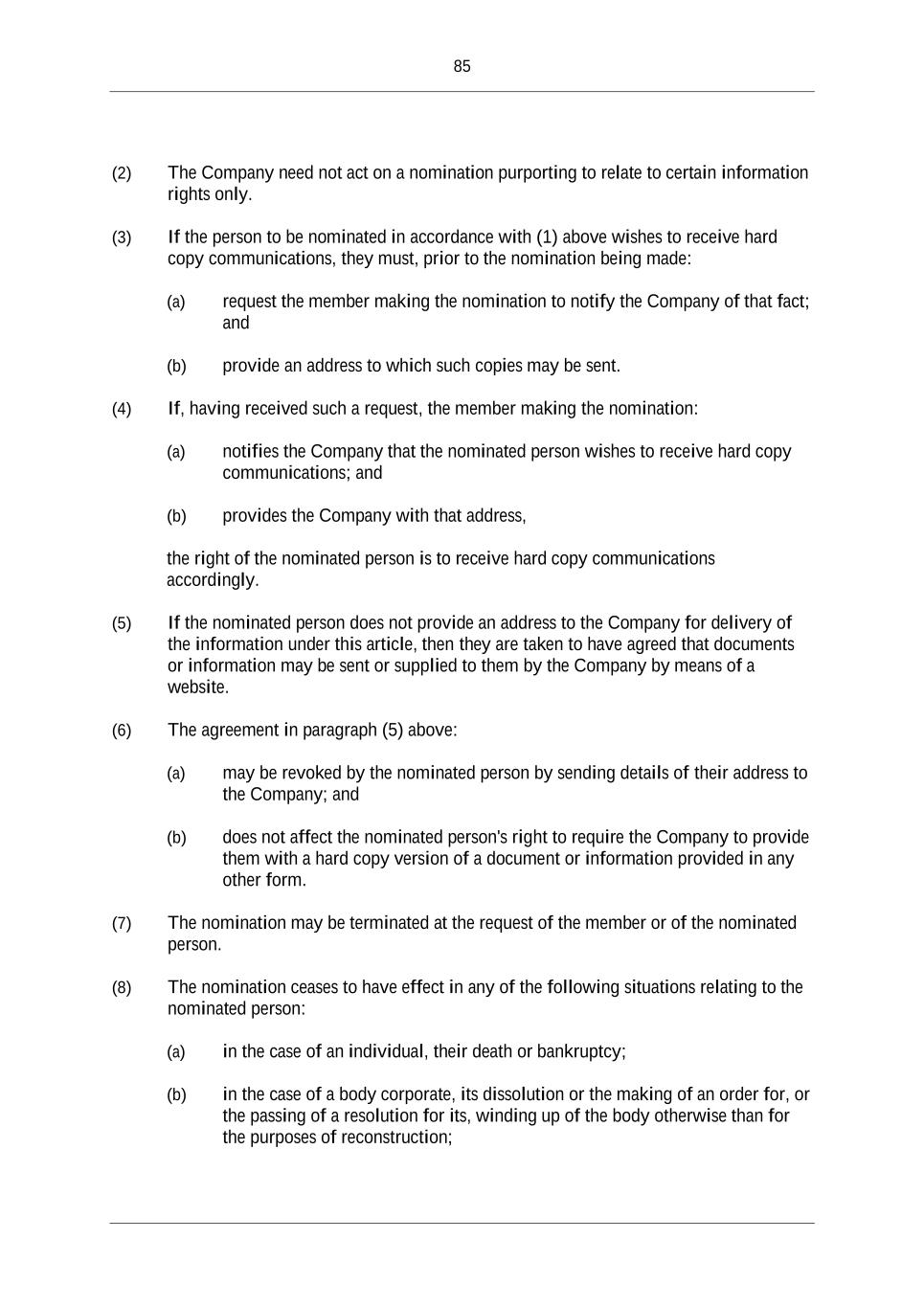 85 (2) The Company need not act on a nomination purporting to relate to certain information rights only. (3) If the person to be nominated in accordance with (1) above wishes to receive hard copy communications, they must, prior to the nomination being made: (a) request the member making the nomination to notify the Company of that fact; and (b) provide an address to which such copies may be sent. (4) If, having received such a request, the member making the nomination: (a) notifies the Company that the nominated person wishes to receive hard copy communications; and (b) provides the Company with that address, the right of the nominated person is to receive hard copy communications accordingly. (5) If the nominated person does not provide an address to the Company for delivery of the information under this article, then they are taken to have agreed that documents or information may be sent or supplied to them by the Company by means of a website. (6) The agreement in paragraph (5) above: (a) may be revoked by the nominated person by sending details of their address to the Company; and (b) does not affect the nominated person's right to require the Company to provide them with a hard copy version of a document or information provided in any other form. (7) The nomination may be terminated at the request of the member or of the nominated person. (8) The nomination ceases to have effect in any of the following situations relating to the nominated person: (a) in the case of an individual, their death or bankruptcy; (b) in the case of a body corporate, its dissolution or the making of an order for, or the passing of a resolution for its, winding up of the body otherwise than for the purposes of reconstruction;