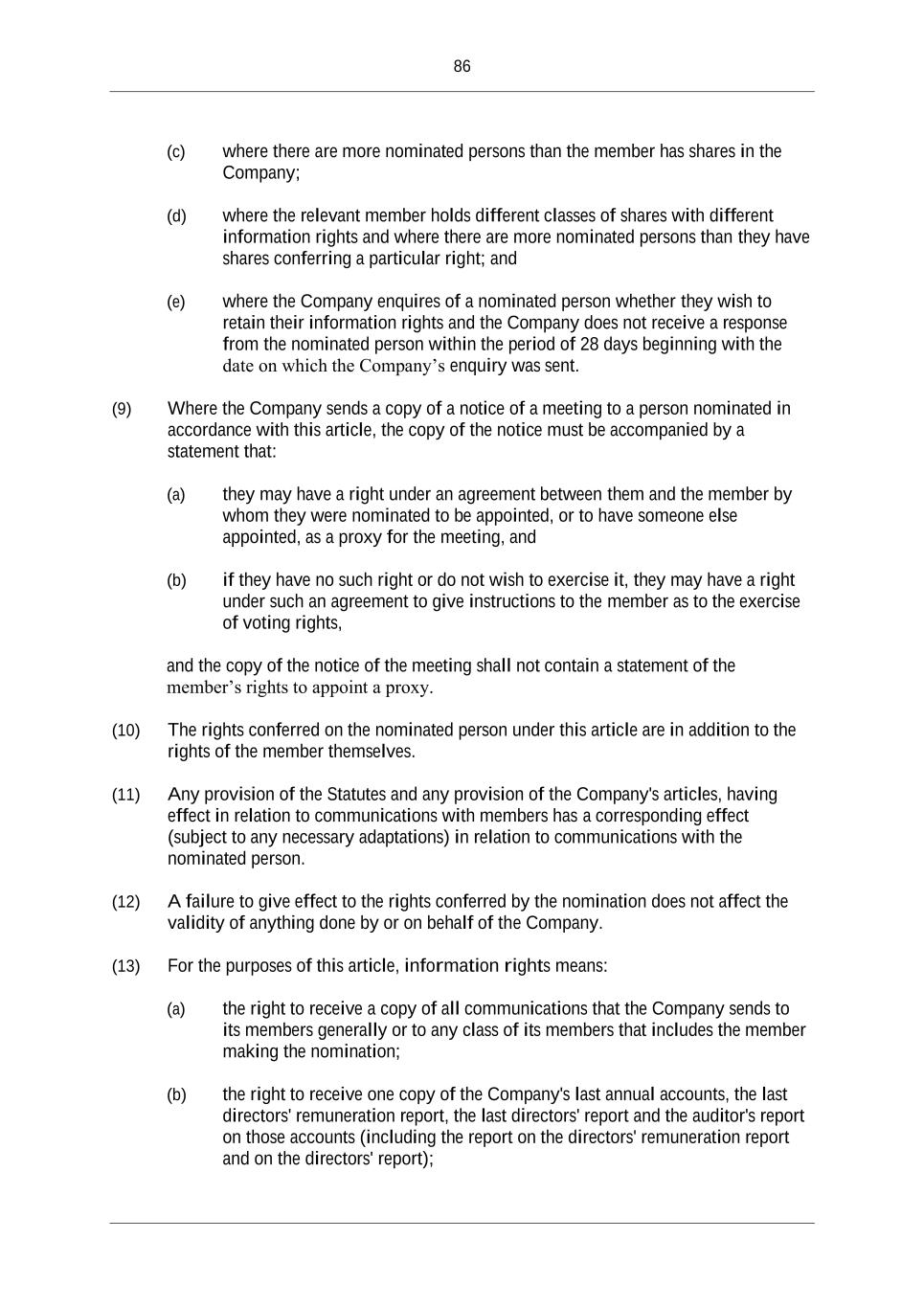 86 (c) where there are more nominated persons than the member has shares in the Company; (d) where the relevant member holds different classes of shares with different information rights and where there are more nominated persons than they have shares conferring a particular right; and (e) where the Company enquires of a nominated person whether they wish to retain their information rights and the Company does not receive a response from the nominated person within the period of 28 days beginning with the date on which the Company’s enquiry was sent. (9) Where the Company sends a copy of a notice of a meeting to a person nominated in accordance with this article, the copy of the notice must be accompanied by a statement that: (a) they may have a right under an agreement between them and the member by whom they were nominated to be appointed, or to have someone else appointed, as a proxy for the meeting, and (b) if they have no such right or do not wish to exercise it, they may have a right under such an agreement to give instructions to the member as to the exercise of voting rights, and the copy of the notice of the meeting shall not contain a statement of the member’s rights to appoint a proxy. (10) The rights conferred on the nominated person under this article are in addition to the rights of the member themselves. (11) Any provision of the Statutes and any provision of the Company's articles, having effect in relation to communications with members has a corresponding effect (subject to any necessary adaptations) in relation to communications with the nominated person. (12) A failure to give effect to the rights conferred by the nomination does not affect the validity of anything done by or on behalf of the Company. (13) For the purposes of this article, information rights means: (a) the right to receive a copy of all communications that the Company sends to its members generally or to any class of its members that includes the member making the nomination; (b) the right to receive one copy of the Company's last annual accounts, the last directors' remuneration report, the last directors' report and the auditor's report on those accounts (including the report on the directors' remuneration report and on the directors' report);