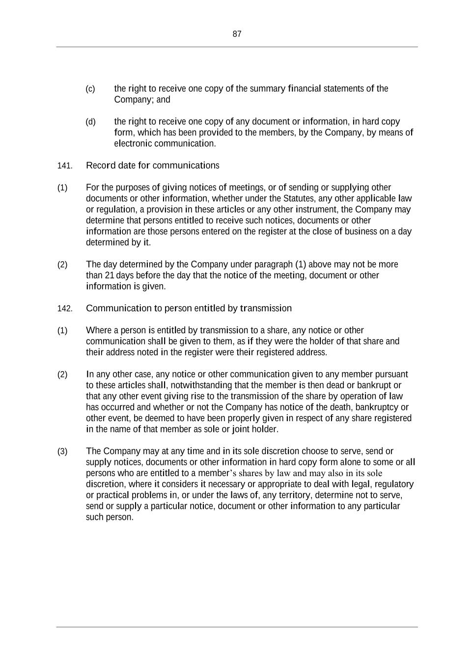87 (c) the right to receive one copy of the summary financial statements of the Company; and (d) the right to receive one copy of any document or information, in hard copy form, which has been provided to the members, by the Company, by means of electronic communication. 141. Record date for communications (1) For the purposes of giving notices of meetings, or of sending or supplying other documents or other information, whether under the Statutes, any other applicable law or regulation, a provision in these articles or any other instrument, the Company may determine that persons entitled to receive such notices, documents or other information are those persons entered on the register at the close of business on a day determined by it. (2) The day determined by the Company under paragraph (1) above may not be more than 21 days before the day that the notice of the meeting, document or other information is given. 142. Communication to person entitled by transmission (1) Where a person is entitled by transmission to a share, any notice or other communication shall be given to them, as if they were the holder of that share and their address noted in the register were their registered address. (2) In any other case, any notice or other communication given to any member pursuant to these articles shall, notwithstanding that the member is then dead or bankrupt or that any other event giving rise to the transmission of the share by operation of law has occurred and whether or not the Company has notice of the death, bankruptcy or other event, be deemed to have been properly given in respect of any share registered in the name of that member as sole or joint holder. (3) The Company may at any time and in its sole discretion choose to serve, send or supply notices, documents or other information in hard copy form alone to some or all persons who are entitled to a member’s shares by law and may also in its sole discretion, where it considers it necessary or appropriate to deal with legal, regulatory or practical problems in, or under the laws of, any territory, determine not to serve, send or supply a particular notice, document or other information to any particular such person.