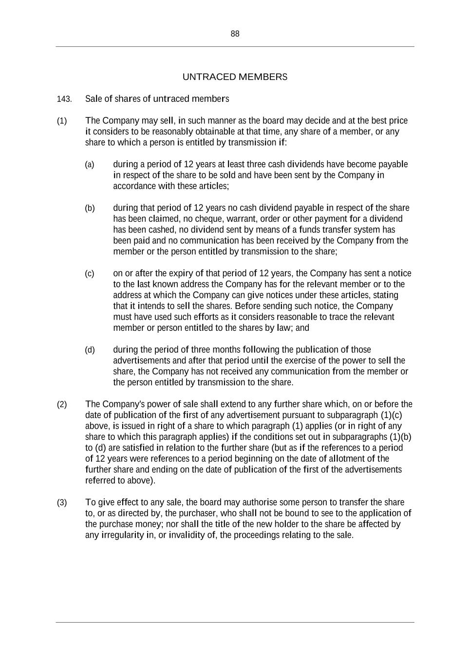 88 UNTRACED MEMBERS 143. Sale of shares of untraced members (1) The Company may sell, in such manner as the board may decide and at the best price it considers to be reasonably obtainable at that time, any share of a member, or any share to which a person is entitled by transmission if: (a) during a period of 12 years at least three cash dividends have become payable in respect of the share to be sold and have been sent by the Company in accordance with these articles; (b) during that period of 12 years no cash dividend payable in respect of the share has been claimed, no cheque, warrant, order or other payment for a dividend has been cashed, no dividend sent by means of a funds transfer system has been paid and no communication has been received by the Company from the member or the person entitled by transmission to the share; (c) on or after the expiry of that period of 12 years, the Company has sent a notice to the last known address the Company has for the relevant member or to the address at which the Company can give notices under these articles, stating that it intends to sell the shares. Before sending such notice, the Company must have used such efforts as it considers reasonable to trace the relevant member or person entitled to the shares by law; and (d) during the period of three months following the publication of those advertisements and after that period until the exercise of the power to sell the share, the Company has not received any communication from the member or the person entitled by transmission to the share. (2) The Company's power of sale shall extend to any further share which, on or before the date of publication of the first of any advertisement pursuant to subparagraph (1)(c) above, is issued in right of a share to which paragraph (1) applies (or in right of any share to which this paragraph applies) if the conditions set out in subparagraphs (1)(b) to (d) are satisfied in relation to the further share (but as if the references to a period of 12 years were references to a period beginning on the date of allotment of the further share and ending on the date of publication of the first of the advertisements referred to above). (3) To give effect to any sale, the board may authorise some person to transfer the share to, or as directed by, the purchaser, who shall not be bound to see to the application of the purchase money; nor shall the title of the new holder to the share be affected by any irregularity in, or invalidity of, the proceedings relating to the sale.