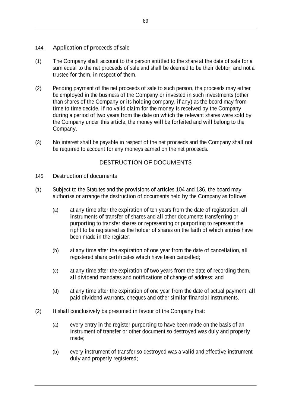 89 144. Application of proceeds of sale (1) The Company shall account to the person entitled to the share at the date of sale for a sum equal to the net proceeds of sale and shall be deemed to be their debtor, and not a trustee for them, in respect of them. (2) Pending payment of the net proceeds of sale to such person, the proceeds may either be employed in the business of the Company or invested in such investments (other than shares of the Company or its holding company, if any) as the board may from time to time decide. If no valid claim for the money is received by the Company during a period of two years from the date on which the relevant shares were sold by the Company under this article, the money will be forfeited and will belong to the Company. (3) No interest shall be payable in respect of the net proceeds and the Company shall not be required to account for any moneys earned on the net proceeds. DESTRUCTION OF DOCUMENTS 145. Destruction of documents (1) Subject to the Statutes and the provisions of articles 104 and 136, the board may authorise or arrange the destruction of documents held by the Company as follows: (a) at any time after the expiration of ten years from the date of registration, all instruments of transfer of shares and all other documents transferring or purporting to transfer shares or representing or purporting to represent the right to be registered as the holder of shares on the faith of which entries have been made in the register; (b) at any time after the expiration of one year from the date of cancellation, all registered share certificates which have been cancelled; (c) at any time after the expiration of two years from the date of recording them, all dividend mandates and notifications of change of address; and (d) at any time after the expiration of one year from the date of actual payment, all paid dividend warrants, cheques and other similar financial instruments. (2) It shall conclusively be presumed in favour of the Company that: (a) every entry in the register purporting to have been made on the basis of an instrument of transfer or other document so destroyed was duly and properly made; (b) every instrument of transfer so destroyed was a valid and effective instrument duly and properly registered;