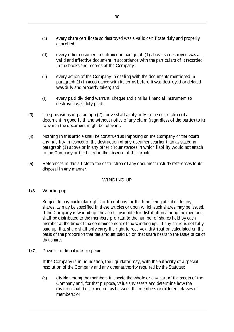 90 (c) every share certificate so destroyed was a valid certificate duly and properly cancelled; (d) every other document mentioned in paragraph (1) above so destroyed was a valid and effective document in accordance with the particulars of it recorded in the books and records of the Company; (e) every action of the Company in dealing with the documents mentioned in paragraph (1) in accordance with its terms before it was destroyed or deleted was duly and properly taken; and (f) every paid dividend warrant, cheque and similar financial instrument so destroyed was duly paid. (3) The provisions of paragraph (2) above shall apply only to the destruction of a document in good faith and without notice of any claim (regardless of the parties to it) to which the document might be relevant. (4) Nothing in this article shall be construed as imposing on the Company or the board any liability in respect of the destruction of any document earlier than as stated in paragraph (1) above or in any other circumstances in which liability would not attach to the Company or the board in the absence of this article. (5) References in this article to the destruction of any document include references to its disposal in any manner. WINDING UP 146. Winding up Subject to any particular rights or limitations for the time being attached to any shares, as may be specified in these articles or upon which such shares may be issued, if the Company is wound up, the assets available for distribution among the members shall be distributed to the members pro rata to the number of shares held by each member at the time of the commencement of the winding up. If any share is not fully paid up, that share shall only carry the right to receive a distribution calculated on the basis of the proportion that the amount paid up on that share bears to the issue price of that share. 147. Powers to distribute in specie If the Company is in liquidation, the liquidator may, with the authority of a special resolution of the Company and any other authority required by the Statutes: (a) divide among the members in specie the whole or any part of the assets of the Company and, for that purpose, value any assets and determine how the division shall be carried out as between the members or different classes of members; or