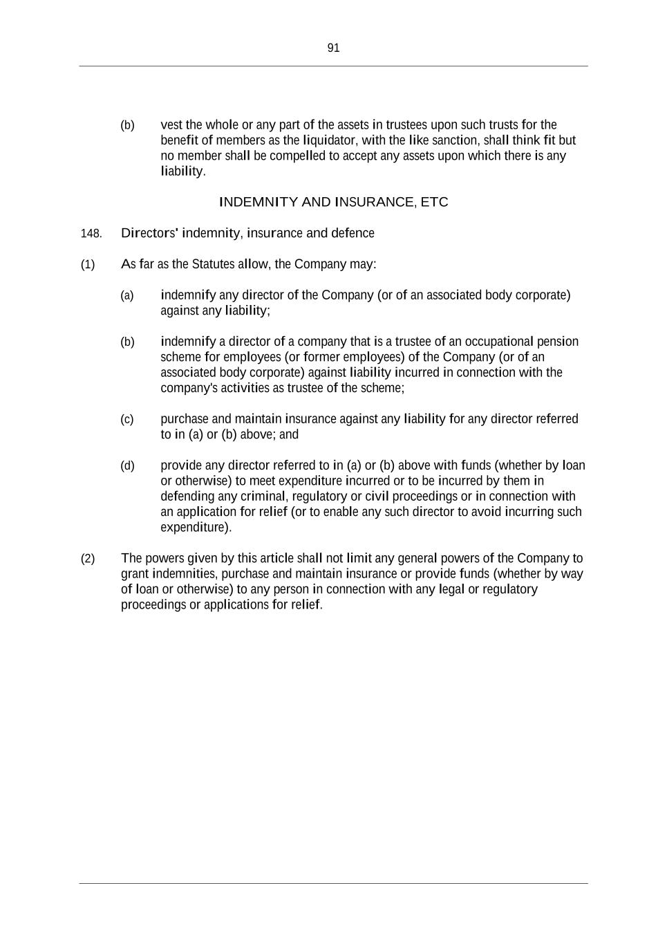 91 (b) vest the whole or any part of the assets in trustees upon such trusts for the benefit of members as the liquidator, with the like sanction, shall think fit but no member shall be compelled to accept any assets upon which there is any liability. INDEMNITY AND INSURANCE, ETC 148. Directors' indemnity, insurance and defence (1) As far as the Statutes allow, the Company may: (a) indemnify any director of the Company (or of an associated body corporate) against any liability; (b) indemnify a director of a company that is a trustee of an occupational pension scheme for employees (or former employees) of the Company (or of an associated body corporate) against liability incurred in connection with the company's activities as trustee of the scheme; (c) purchase and maintain insurance against any liability for any director referred to in (a) or (b) above; and (d) provide any director referred to in (a) or (b) above with funds (whether by loan or otherwise) to meet expenditure incurred or to be incurred by them in defending any criminal, regulatory or civil proceedings or in connection with an application for relief (or to enable any such director to avoid incurring such expenditure). (2) The powers given by this article shall not limit any general powers of the Company to grant indemnities, purchase and maintain insurance or provide funds (whether by way of loan or otherwise) to any person in connection with any legal or regulatory proceedings or applications for relief.