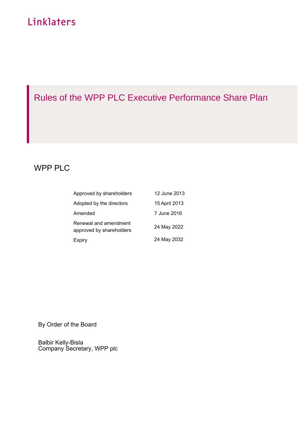 Rules of the WPP PLC Executive Performance Share Plan WPP PLC Approved by shareholders 12 June 2013 Adopted by the directors 15 April 2013 Amended 7 June 2016 Renewal and amendment approved by shareholders Expiry By Order of the Board Balbir Kelly-Bisla Company Secretary, WPP plc 24 May 2022 24 May 2032