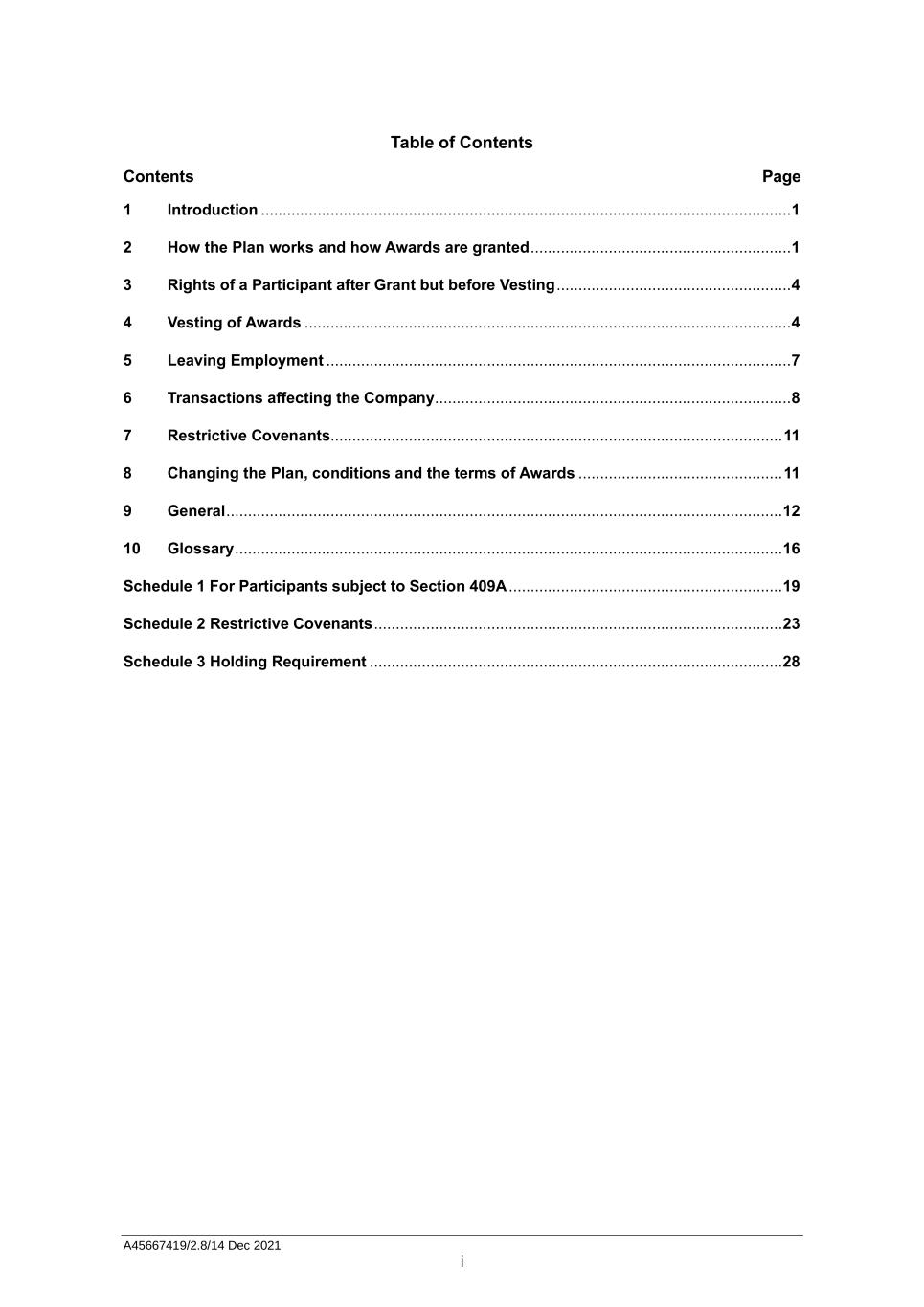 A45667419/2.8/14 Dec 2021 i Table of Contents Contents Page 1 Introduction .......................................................................................................................... 1 2 How the Plan works and how Awards are granted ............................................................ 1 3 Rights of a Participant after Grant but before Vesting ...................................................... 4 4 Vesting of Awards ................................................................................................................ 4 5 Leaving Employment ........................................................................................................... 7 6 Transactions affecting the Company.................................................................................. 8 7 Restrictive Covenants........................................................................................................ 11 8 Changing the Plan, conditions and the terms of Awards ............................................... 11 9 General ................................................................................................................................ 12 10 Glossary .............................................................................................................................. 16 Schedule 1 For Participants subject to Section 409A ............................................................... 19 Schedule 2 Restrictive Covenants .............................................................................................. 23 Schedule 3 Holding Requirement ............................................................................................... 28