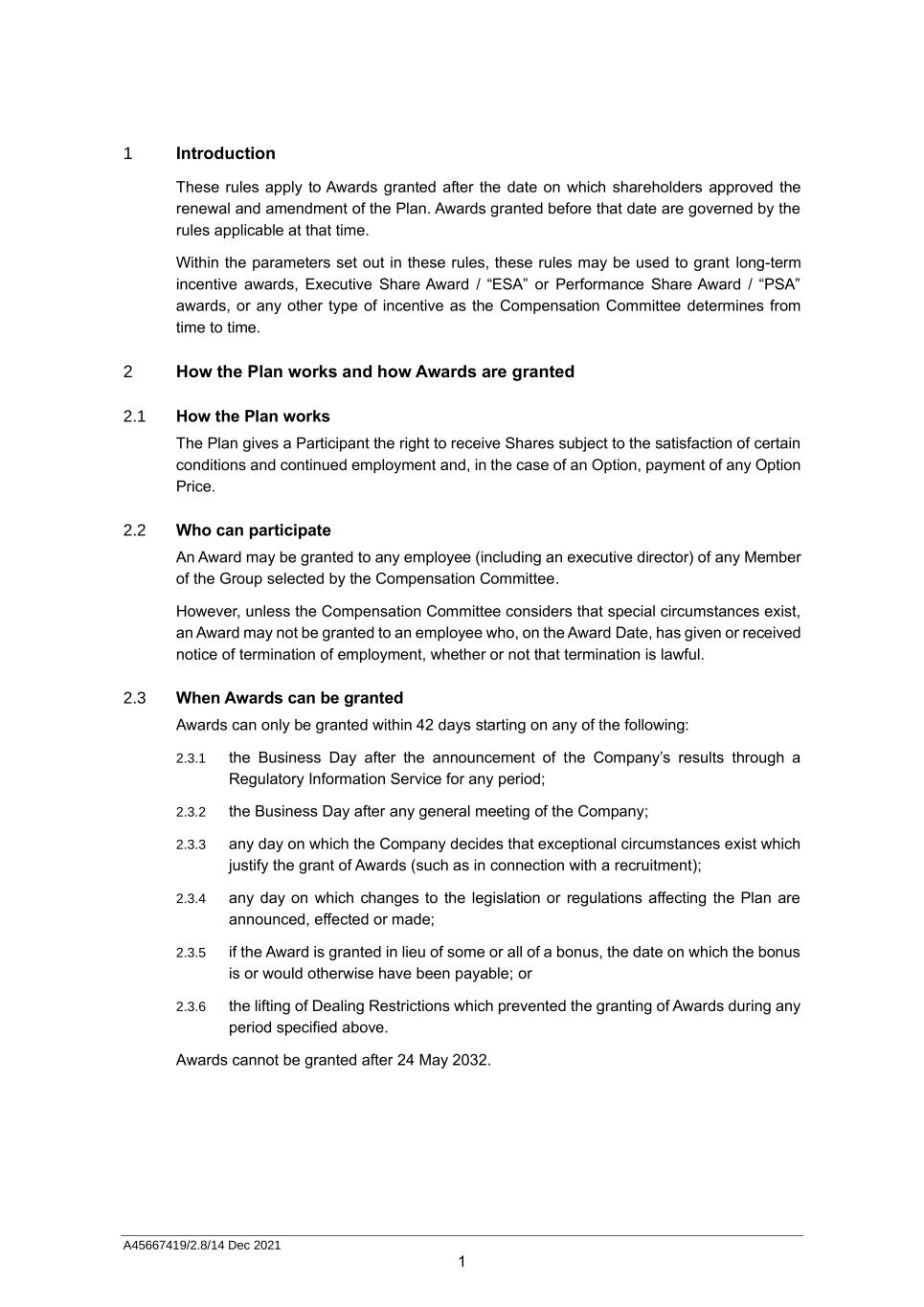 A45667419/2.8/14 Dec 2021 1 1 Introduction These rules apply to Awards granted after the date on which shareholders approved the renewal and amendment of the Plan. Awards granted before that date are governed by the rules applicable at that time. Within the parameters set out in these rules, these rules may be used to grant long-term incentive awards, Executive Share Award / “ESA” or Performance Share Award / “PSA” awards, or any other type of incentive as the Compensation Committee determines from time to time. 2 How the Plan works and how Awards are granted 2.1 How the Plan works The Plan gives a Participant the right to receive Shares subject to the satisfaction of certain conditions and continued employment and, in the case of an Option, payment of any Option Price. 2.2 Who can participate An Award may be granted to any employee (including an executive director) of any Member of the Group selected by the Compensation Committee. However, unless the Compensation Committee considers that special circumstances exist, an Award may not be granted to an employee who, on the Award Date, has given or received notice of termination of employment, whether or not that termination is lawful. 2.3 When Awards can be granted Awards can only be granted within 42 days starting on any of the following: 2.3.1 the Business Day after the announcement of the Company’s results through a Regulatory Information Service for any period; 2.3.2 the Business Day after any general meeting of the Company; 2.3.3 any day on which the Company decides that exceptional circumstances exist which justify the grant of Awards (such as in connection with a recruitment); 2.3.4 any day on which changes to the legislation or regulations affecting the Plan are announced, effected or made; 2.3.5 if the Award is granted in lieu of some or all of a bonus, the date on which the bonus is or would otherwise have been payable; or 2.3.6 the lifting of Dealing Restrictions which prevented the granting of Awards during any period specified above. Awards cannot be granted after 24 May 2032.