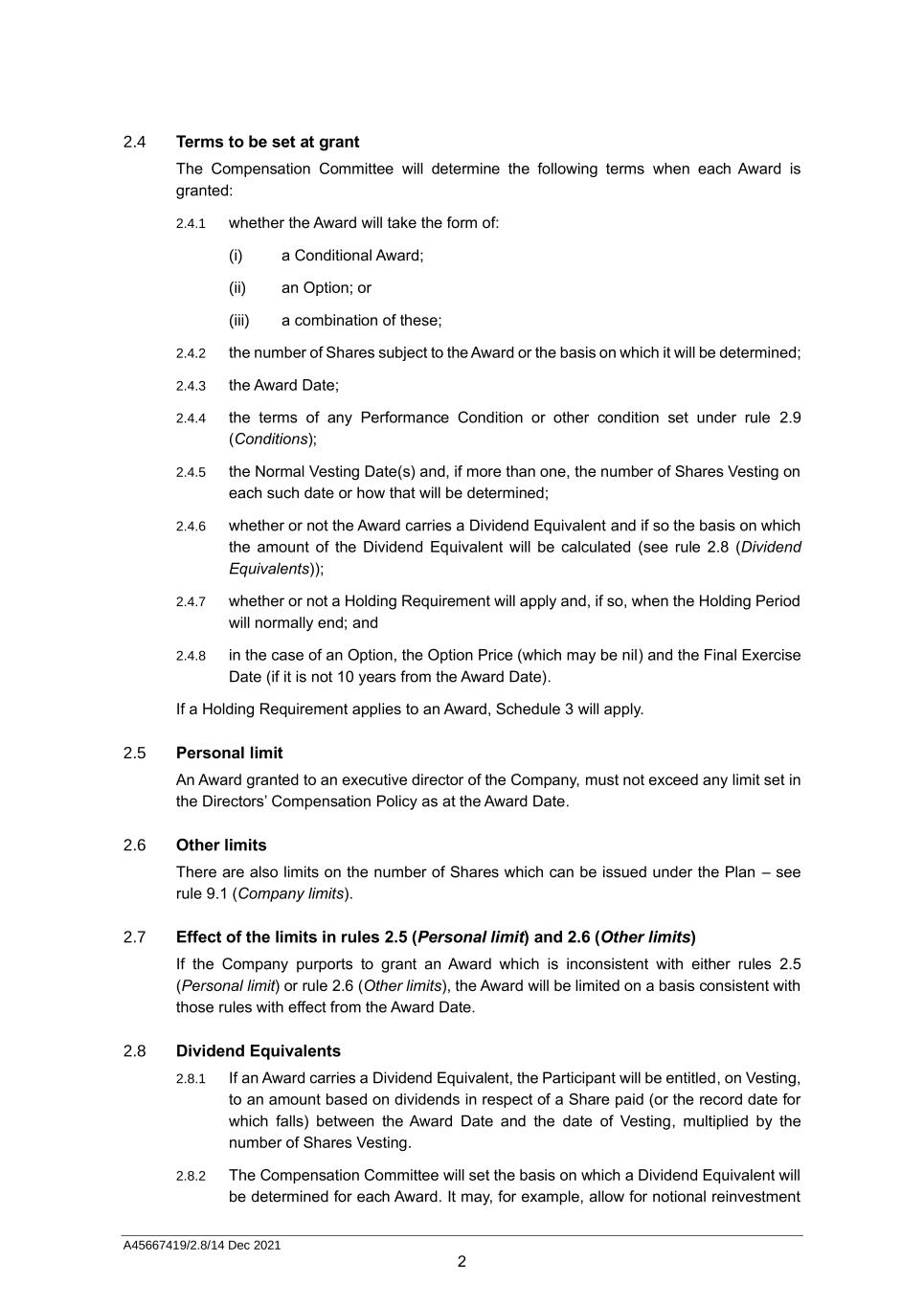 A45667419/2.8/14 Dec 2021 2 2.4 Terms to be set at grant The Compensation Committee will determine the following terms when each Award is granted: 2.4.1 whether the Award will take the form of: (i) a Conditional Award; (ii) an Option; or (iii) a combination of these; 2.4.2 the number of Shares subject to the Award or the basis on which it will be determined; 2.4.3 the Award Date; 2.4.4 the terms of any Performance Condition or other condition set under rule 2.9 (Conditions); 2.4.5 the Normal Vesting Date(s) and, if more than one, the number of Shares Vesting on each such date or how that will be determined; 2.4.6 whether or not the Award carries a Dividend Equivalent and if so the basis on which the amount of the Dividend Equivalent will be calculated (see rule 2.8 (Dividend Equivalents)); 2.4.7 whether or not a Holding Requirement will apply and, if so, when the Holding Period will normally end; and 2.4.8 in the case of an Option, the Option Price (which may be nil) and the Final Exercise Date (if it is not 10 years from the Award Date). If a Holding Requirement applies to an Award, Schedule 3 will apply. 2.5 Personal limit An Award granted to an executive director of the Company, must not exceed any limit set in the Directors’ Compensation Policy as at the Award Date. 2.6 Other limits There are also limits on the number of Shares which can be issued under the Plan – see rule 9.1 (Company limits). 2.7 Effect of the limits in rules 2.5 (Personal limit) and 2.6 (Other limits) If the Company purports to grant an Award which is inconsistent with either rules 2.5 (Personal limit) or rule 2.6 (Other limits), the Award will be limited on a basis consistent with those rules with effect from the Award Date. 2.8 Dividend Equivalents 2.8.1 If an Award carries a Dividend Equivalent, the Participant will be entitled, on Vesting, to an amount based on dividends in respect of a Share paid (or the record date for which falls) between the Award Date and the date of Vesting, multiplied by the number of Shares Vesting. 2.8.2 The Compensation Committee will set the basis on which a Dividend Equivalent will be determined for each Award. It may, for example, allow for notional reinvestment