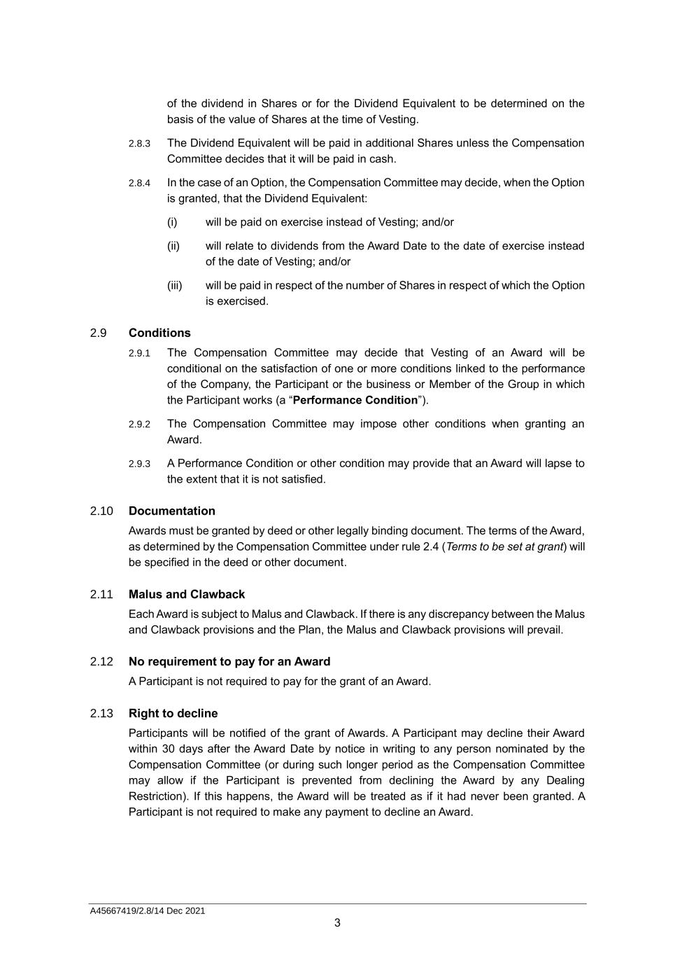 A45667419/2.8/14 Dec 2021 3 of the dividend in Shares or for the Dividend Equivalent to be determined on the basis of the value of Shares at the time of Vesting. 2.8.3 The Dividend Equivalent will be paid in additional Shares unless the Compensation Committee decides that it will be paid in cash. 2.8.4 In the case of an Option, the Compensation Committee may decide, when the Option is granted, that the Dividend Equivalent: (i) will be paid on exercise instead of Vesting; and/or (ii) will relate to dividends from the Award Date to the date of exercise instead of the date of Vesting; and/or (iii) will be paid in respect of the number of Shares in respect of which the Option is exercised. 2.9 Conditions 2.9.1 The Compensation Committee may decide that Vesting of an Award will be conditional on the satisfaction of one or more conditions linked to the performance of the Company, the Participant or the business or Member of the Group in which the Participant works (a “Performance Condition”). 2.9.2 The Compensation Committee may impose other conditions when granting an Award. 2.9.3 A Performance Condition or other condition may provide that an Award will lapse to the extent that it is not satisfied. 2.10 Documentation Awards must be granted by deed or other legally binding document. The terms of the Award, as determined by the Compensation Committee under rule 2.4 (Terms to be set at grant) will be specified in the deed or other document. 2.11 Malus and Clawback Each Award is subject to Malus and Clawback. If there is any discrepancy between the Malus and Clawback provisions and the Plan, the Malus and Clawback provisions will prevail. 2.12 No requirement to pay for an Award A Participant is not required to pay for the grant of an Award. 2.13 Right to decline Participants will be notified of the grant of Awards. A Participant may decline their Award within 30 days after the Award Date by notice in writing to any person nominated by the Compensation Committee (or during such longer period as the Compensation Committee may allow if the Participant is prevented from declining the Award by any Dealing Restriction). If this happens, the Award will be treated as if it had never been granted. A Participant is not required to make any payment to decline an Award.