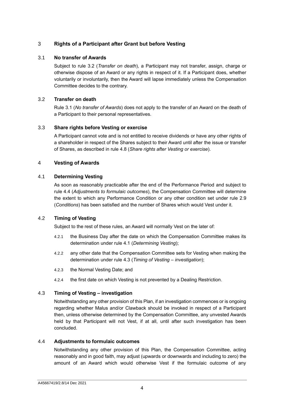 A45667419/2.8/14 Dec 2021 4 3 Rights of a Participant after Grant but before Vesting 3.1 No transfer of Awards Subject to rule 3.2 (Transfer on death), a Participant may not transfer, assign, charge or otherwise dispose of an Award or any rights in respect of it. If a Participant does, whether voluntarily or involuntarily, then the Award will lapse immediately unless the Compensation Committee decides to the contrary. 3.2 Transfer on death Rule 3.1 (No transfer of Awards) does not apply to the transfer of an Award on the death of a Participant to their personal representatives. 3.3 Share rights before Vesting or exercise A Participant cannot vote and is not entitled to receive dividends or have any other rights of a shareholder in respect of the Shares subject to their Award until after the issue or transfer of Shares, as described in rule 4.8 (Share rights after Vesting or exercise). 4 Vesting of Awards 4.1 Determining Vesting As soon as reasonably practicable after the end of the Performance Period and subject to rule 4.4 (Adjustments to formulaic outcomes), the Compensation Committee will determine the extent to which any Performance Condition or any other condition set under rule 2.9 (Conditions) has been satisfied and the number of Shares which would Vest under it. 4.2 Timing of Vesting Subject to the rest of these rules, an Award will normally Vest on the later of: 4.2.1 the Business Day after the date on which the Compensation Committee makes its determination under rule 4.1 (Determining Vesting); 4.2.2 any other date that the Compensation Committee sets for Vesting when making the determination under rule 4.3 (Timing of Vesting – investigation); 4.2.3 the Normal Vesting Date; and 4.2.4 the first date on which Vesting is not prevented by a Dealing Restriction. 4.3 Timing of Vesting – investigation Notwithstanding any other provision of this Plan, if an investigation commences or is ongoing regarding whether Malus and/or Clawback should be invoked in respect of a Participant then, unless otherwise determined by the Compensation Committee, any unvested Awards held by that Participant will not Vest, if at all, until after such investigation has been concluded. 4.4 Adjustments to formulaic outcomes Notwithstanding any other provision of this Plan, the Compensation Committee, acting reasonably and in good faith, may adjust (upwards or downwards and including to zero) the amount of an Award which would otherwise Vest if the formulaic outcome of any