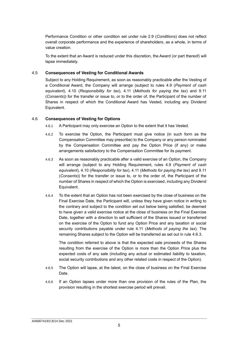 A45667419/2.8/14 Dec 2021 5 Performance Condition or other condition set under rule 2.9 (Conditions) does not reflect overall corporate performance and the experience of shareholders, as a whole, in terms of value creation. To the extent that an Award is reduced under this discretion, the Award (or part thereof) will lapse immediately. 4.5 Consequences of Vesting for Conditional Awards Subject to any Holding Requirement, as soon as reasonably practicable after the Vesting of a Conditional Award, the Company will arrange (subject to rules 4.9 (Payment of cash equivalent), 4.10 (Responsibility for tax), 4.11 (Methods for paying the tax) and 9.11 (Consents)) for the transfer or issue to, or to the order of, the Participant of the number of Shares in respect of which the Conditional Award has Vested, including any Dividend Equivalent. 4.6 Consequences of Vesting for Options 4.6.1 A Participant may only exercise an Option to the extent that it has Vested. 4.6.2 To exercise the Option, the Participant must give notice (in such form as the Compensation Committee may prescribe) to the Company or any person nominated by the Compensation Committee and pay the Option Price (if any) or make arrangements satisfactory to the Compensation Committee for its payment. 4.6.3 As soon as reasonably practicable after a valid exercise of an Option, the Company will arrange (subject to any Holding Requirement, rules 4.9 (Payment of cash equivalent), 4.10 (Responsibility for tax), 4.11 (Methods for paying the tax) and 9.11 (Consents)) for the transfer or issue to, or to the order of, the Participant of the number of Shares in respect of which the Option is exercised, including any Dividend Equivalent. 4.6.4 To the extent that an Option has not been exercised by the close of business on the Final Exercise Date, the Participant will, unless they have given notice in writing to the contrary and subject to the condition set out below being satisfied, be deemed to have given a valid exercise notice at the close of business on the Final Exercise Date, together with a direction to sell sufficient of the Shares issued or transferred on the exercise of the Option to fund any Option Price and any taxation or social security contributions payable under rule 4.11 (Methods of paying the tax). The remaining Shares subject to the Option will be transferred as set out in rule 4.6.3. The condition referred to above is that the expected sale proceeds of the Shares resulting from the exercise of the Option is more than the Option Price plus the expected costs of any sale (including any actual or estimated liability to taxation, social security contributions and any other related costs in respect of the Option). 4.6.5 The Option will lapse, at the latest, on the close of business on the Final Exercise Date. 4.6.6 If an Option lapses under more than one provision of the rules of the Plan, the provision resulting in the shortest exercise period will prevail.
