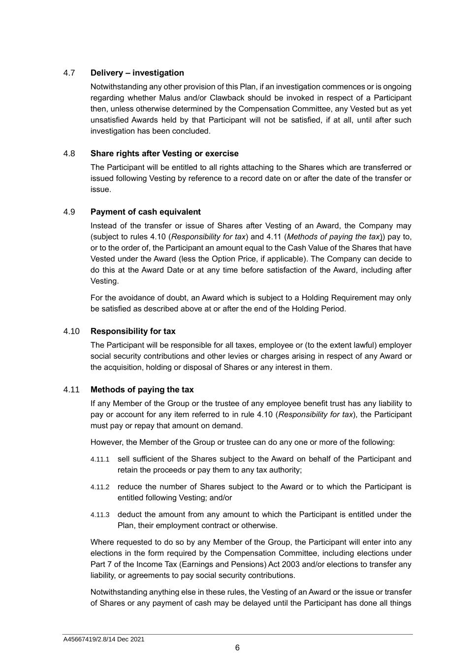 A45667419/2.8/14 Dec 2021 6 4.7 Delivery – investigation Notwithstanding any other provision of this Plan, if an investigation commences or is ongoing regarding whether Malus and/or Clawback should be invoked in respect of a Participant then, unless otherwise determined by the Compensation Committee, any Vested but as yet unsatisfied Awards held by that Participant will not be satisfied, if at all, until after such investigation has been concluded. 4.8 Share rights after Vesting or exercise The Participant will be entitled to all rights attaching to the Shares which are transferred or issued following Vesting by reference to a record date on or after the date of the transfer or issue. 4.9 Payment of cash equivalent Instead of the transfer or issue of Shares after Vesting of an Award, the Company may (subject to rules 4.10 (Responsibility for tax) and 4.11 (Methods of paying the tax)) pay to, or to the order of, the Participant an amount equal to the Cash Value of the Shares that have Vested under the Award (less the Option Price, if applicable). The Company can decide to do this at the Award Date or at any time before satisfaction of the Award, including after Vesting. For the avoidance of doubt, an Award which is subject to a Holding Requirement may only be satisfied as described above at or after the end of the Holding Period. 4.10 Responsibility for tax The Participant will be responsible for all taxes, employee or (to the extent lawful) employer social security contributions and other levies or charges arising in respect of any Award or the acquisition, holding or disposal of Shares or any interest in them. 4.11 Methods of paying the tax If any Member of the Group or the trustee of any employee benefit trust has any liability to pay or account for any item referred to in rule 4.10 (Responsibility for tax), the Participant must pay or repay that amount on demand. However, the Member of the Group or trustee can do any one or more of the following: 4.11.1 sell sufficient of the Shares subject to the Award on behalf of the Participant and retain the proceeds or pay them to any tax authority; 4.11.2 reduce the number of Shares subject to the Award or to which the Participant is entitled following Vesting; and/or 4.11.3 deduct the amount from any amount to which the Participant is entitled under the Plan, their employment contract or otherwise. Where requested to do so by any Member of the Group, the Participant will enter into any elections in the form required by the Compensation Committee, including elections under Part 7 of the Income Tax (Earnings and Pensions) Act 2003 and/or elections to transfer any liability, or agreements to pay social security contributions. Notwithstanding anything else in these rules, the Vesting of an Award or the issue or transfer of Shares or any payment of cash may be delayed until the Participant has done all things
