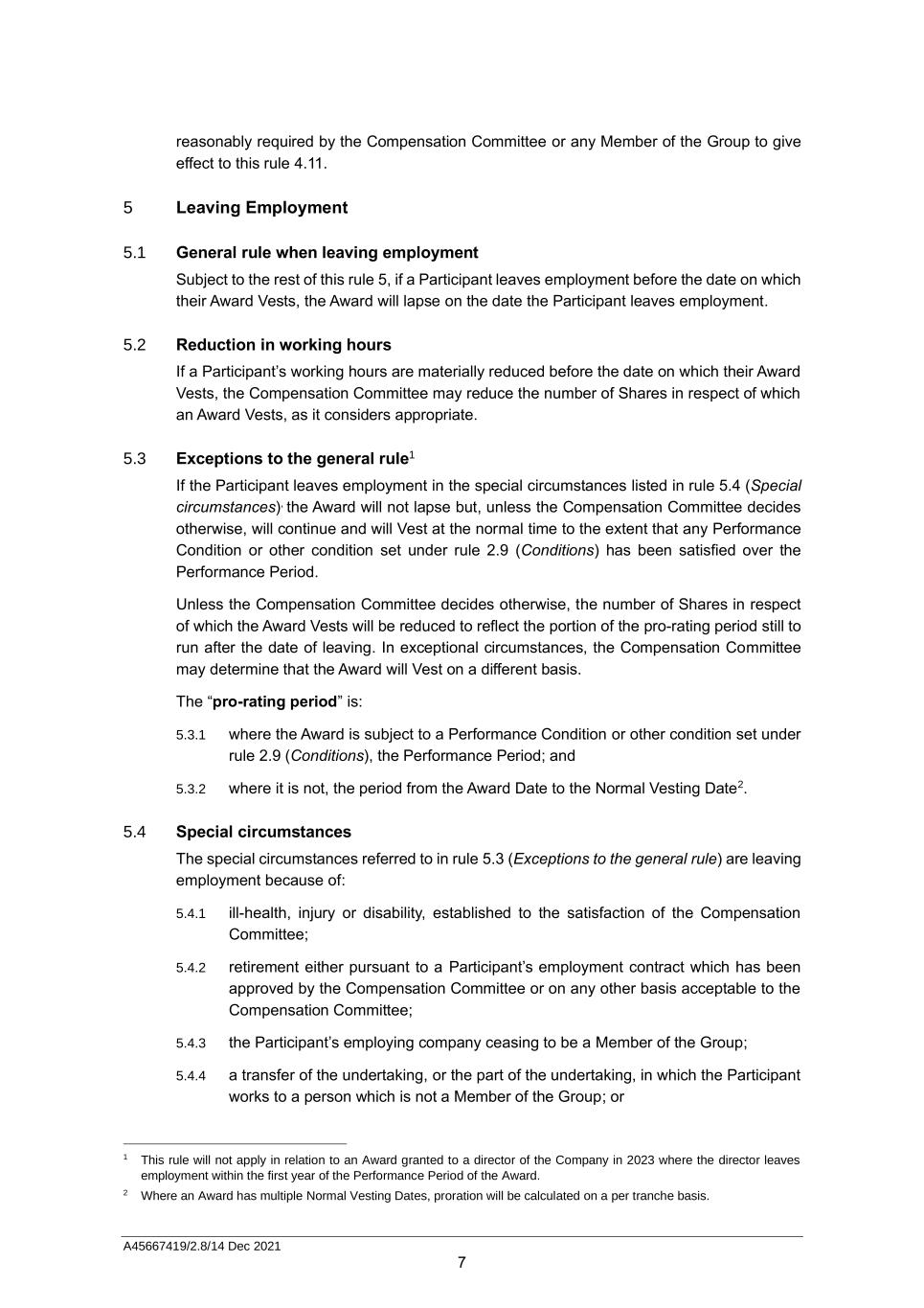 A45667419/2.8/14 Dec 2021 7 reasonably required by the Compensation Committee or any Member of the Group to give effect to this rule 4.11. 5 Leaving Employment 5.1 General rule when leaving employment Subject to the rest of this rule 5, if a Participant leaves employment before the date on which their Award Vests, the Award will lapse on the date the Participant leaves employment. 5.2 Reduction in working hours If a Participant’s working hours are materially reduced before the date on which their Award Vests, the Compensation Committee may reduce the number of Shares in respect of which an Award Vests, as it considers appropriate. 5.3 Exceptions to the general rule1 If the Participant leaves employment in the special circumstances listed in rule 5.4 (Special circumstances), the Award will not lapse but, unless the Compensation Committee decides otherwise, will continue and will Vest at the normal time to the extent that any Performance Condition or other condition set under rule 2.9 (Conditions) has been satisfied over the Performance Period. Unless the Compensation Committee decides otherwise, the number of Shares in respect of which the Award Vests will be reduced to reflect the portion of the pro-rating period still to run after the date of leaving. In exceptional circumstances, the Compensation Committee may determine that the Award will Vest on a different basis. The “pro-rating period” is: 5.3.1 where the Award is subject to a Performance Condition or other condition set under rule 2.9 (Conditions), the Performance Period; and 5.3.2 where it is not, the period from the Award Date to the Normal Vesting Date2. 5.4 Special circumstances The special circumstances referred to in rule 5.3 (Exceptions to the general rule) are leaving employment because of: 5.4.1 ill-health, injury or disability, established to the satisfaction of the Compensation Committee; 5.4.2 retirement either pursuant to a Participant’s employment contract which has been approved by the Compensation Committee or on any other basis acceptable to the Compensation Committee; 5.4.3 the Participant’s employing company ceasing to be a Member of the Group; 5.4.4 a transfer of the undertaking, or the part of the undertaking, in which the Participant works to a person which is not a Member of the Group; or 1 This rule will not apply in relation to an Award granted to a director of the Company in 2023 where the director leaves employment within the first year of the Performance Period of the Award. 2 Where an Award has multiple Normal Vesting Dates, proration will be calculated on a per tranche basis.