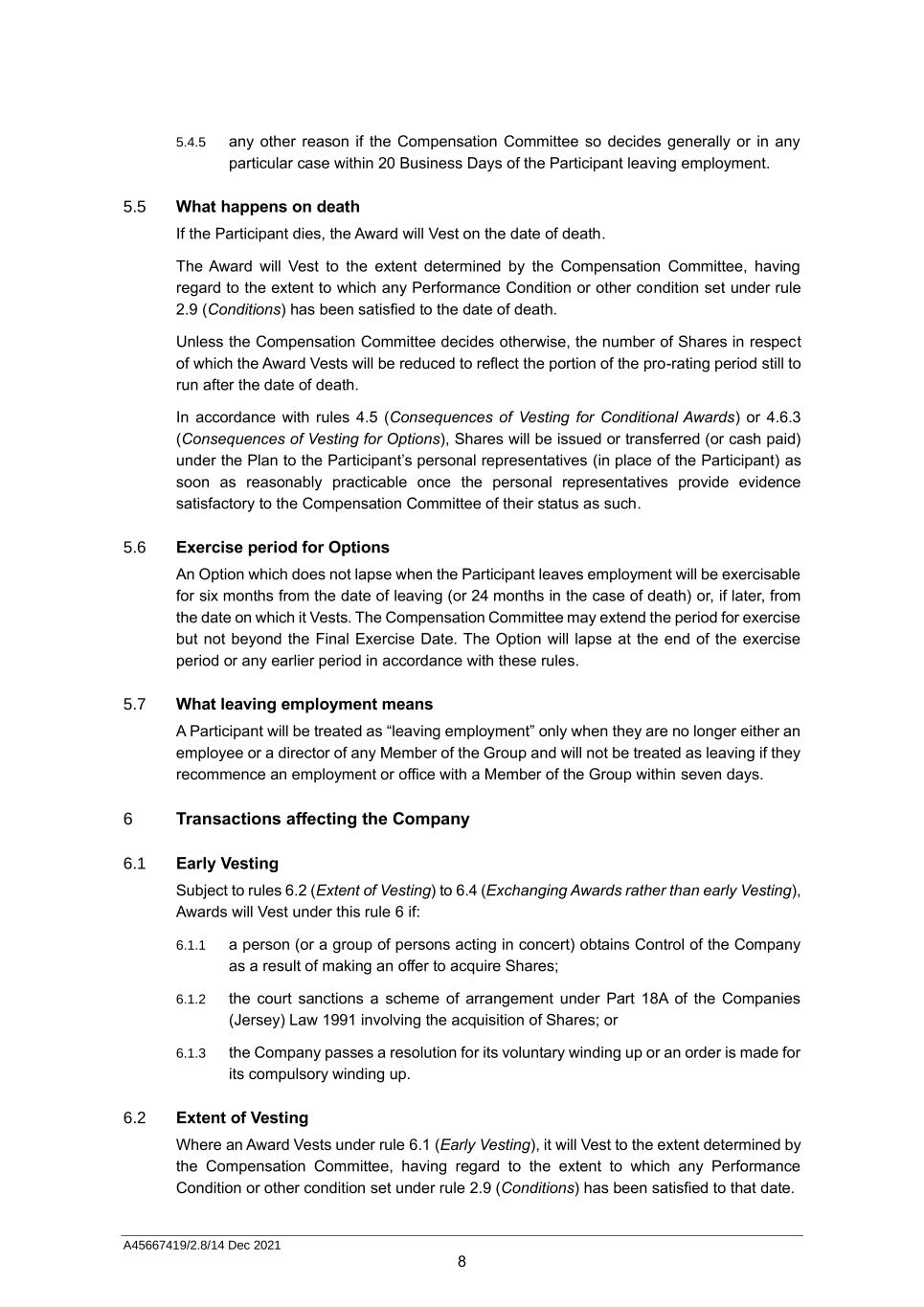 A45667419/2.8/14 Dec 2021 8 5.4.5 any other reason if the Compensation Committee so decides generally or in any particular case within 20 Business Days of the Participant leaving employment. 5.5 What happens on death If the Participant dies, the Award will Vest on the date of death. The Award will Vest to the extent determined by the Compensation Committee, having regard to the extent to which any Performance Condition or other condition set under rule 2.9 (Conditions) has been satisfied to the date of death. Unless the Compensation Committee decides otherwise, the number of Shares in respect of which the Award Vests will be reduced to reflect the portion of the pro-rating period still to run after the date of death. In accordance with rules 4.5 (Consequences of Vesting for Conditional Awards) or 4.6.3 (Consequences of Vesting for Options), Shares will be issued or transferred (or cash paid) under the Plan to the Participant’s personal representatives (in place of the Participant) as soon as reasonably practicable once the personal representatives provide evidence satisfactory to the Compensation Committee of their status as such. 5.6 Exercise period for Options An Option which does not lapse when the Participant leaves employment will be exercisable for six months from the date of leaving (or 24 months in the case of death) or, if later, from the date on which it Vests. The Compensation Committee may extend the period for exercise but not beyond the Final Exercise Date. The Option will lapse at the end of the exercise period or any earlier period in accordance with these rules. 5.7 What leaving employment means A Participant will be treated as “leaving employment” only when they are no longer either an employee or a director of any Member of the Group and will not be treated as leaving if they recommence an employment or office with a Member of the Group within seven days. 6 Transactions affecting the Company 6.1 Early Vesting Subject to rules 6.2 (Extent of Vesting) to 6.4 (Exchanging Awards rather than early Vesting), Awards will Vest under this rule 6 if: 6.1.1 a person (or a group of persons acting in concert) obtains Control of the Company as a result of making an offer to acquire Shares; 6.1.2 the court sanctions a scheme of arrangement under Part 18A of the Companies (Jersey) Law 1991 involving the acquisition of Shares; or 6.1.3 the Company passes a resolution for its voluntary winding up or an order is made for its compulsory winding up. 6.2 Extent of Vesting Where an Award Vests under rule 6.1 (Early Vesting), it will Vest to the extent determined by the Compensation Committee, having regard to the extent to which any Performance Condition or other condition set under rule 2.9 (Conditions) has been satisfied to that date.