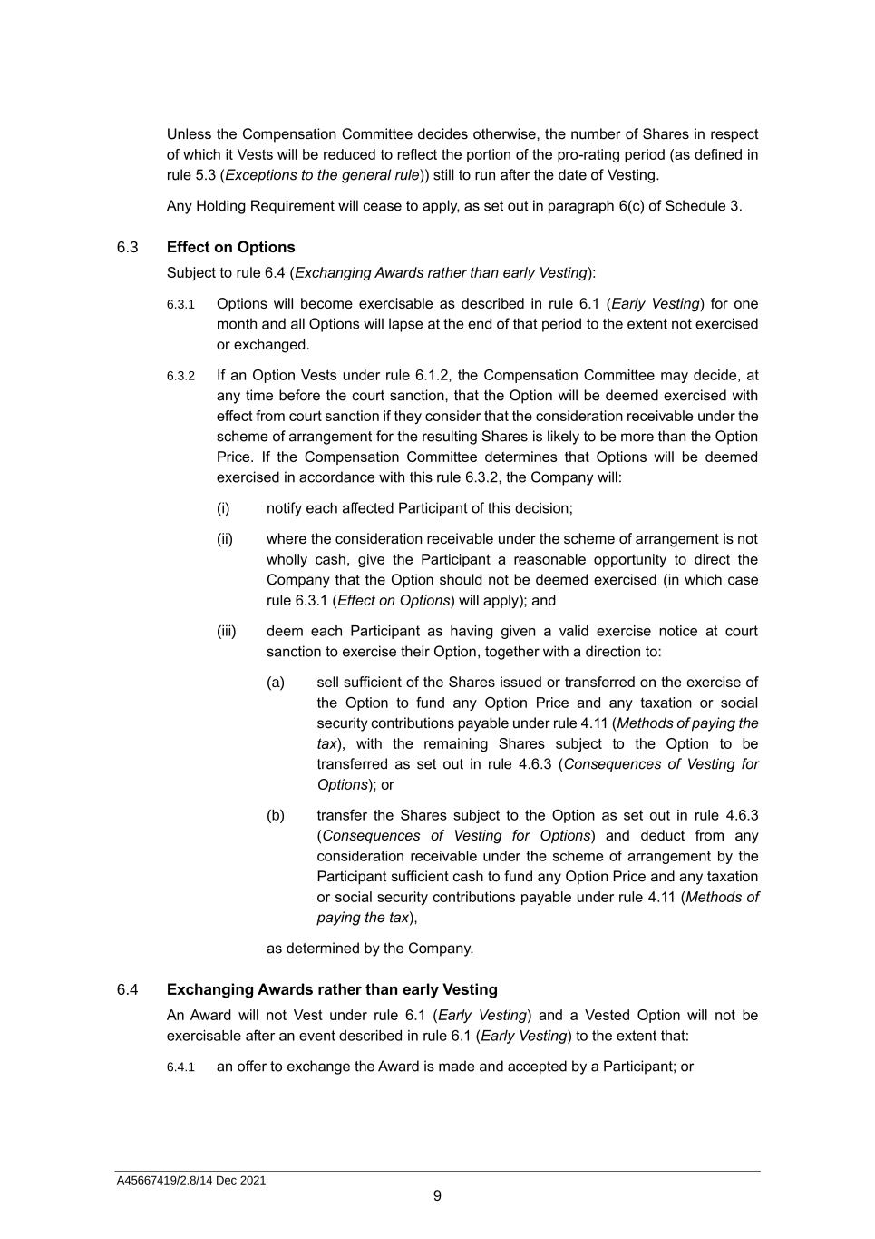 A45667419/2.8/14 Dec 2021 9 Unless the Compensation Committee decides otherwise, the number of Shares in respect of which it Vests will be reduced to reflect the portion of the pro-rating period (as defined in rule 5.3 (Exceptions to the general rule)) still to run after the date of Vesting. Any Holding Requirement will cease to apply, as set out in paragraph 6(c) of Schedule 3. 6.3 Effect on Options Subject to rule 6.4 (Exchanging Awards rather than early Vesting): 6.3.1 Options will become exercisable as described in rule 6.1 (Early Vesting) for one month and all Options will lapse at the end of that period to the extent not exercised or exchanged. 6.3.2 If an Option Vests under rule 6.1.2, the Compensation Committee may decide, at any time before the court sanction, that the Option will be deemed exercised with effect from court sanction if they consider that the consideration receivable under the scheme of arrangement for the resulting Shares is likely to be more than the Option Price. If the Compensation Committee determines that Options will be deemed exercised in accordance with this rule 6.3.2, the Company will: (i) notify each affected Participant of this decision; (ii) where the consideration receivable under the scheme of arrangement is not wholly cash, give the Participant a reasonable opportunity to direct the Company that the Option should not be deemed exercised (in which case rule 6.3.1 (Effect on Options) will apply); and (iii) deem each Participant as having given a valid exercise notice at court sanction to exercise their Option, together with a direction to: (a) sell sufficient of the Shares issued or transferred on the exercise of the Option to fund any Option Price and any taxation or social security contributions payable under rule 4.11 (Methods of paying the tax), with the remaining Shares subject to the Option to be transferred as set out in rule 4.6.3 (Consequences of Vesting for Options); or (b) transfer the Shares subject to the Option as set out in rule 4.6.3 (Consequences of Vesting for Options) and deduct from any consideration receivable under the scheme of arrangement by the Participant sufficient cash to fund any Option Price and any taxation or social security contributions payable under rule 4.11 (Methods of paying the tax), as determined by the Company. 6.4 Exchanging Awards rather than early Vesting An Award will not Vest under rule 6.1 (Early Vesting) and a Vested Option will not be exercisable after an event described in rule 6.1 (Early Vesting) to the extent that: 6.4.1 an offer to exchange the Award is made and accepted by a Participant; or