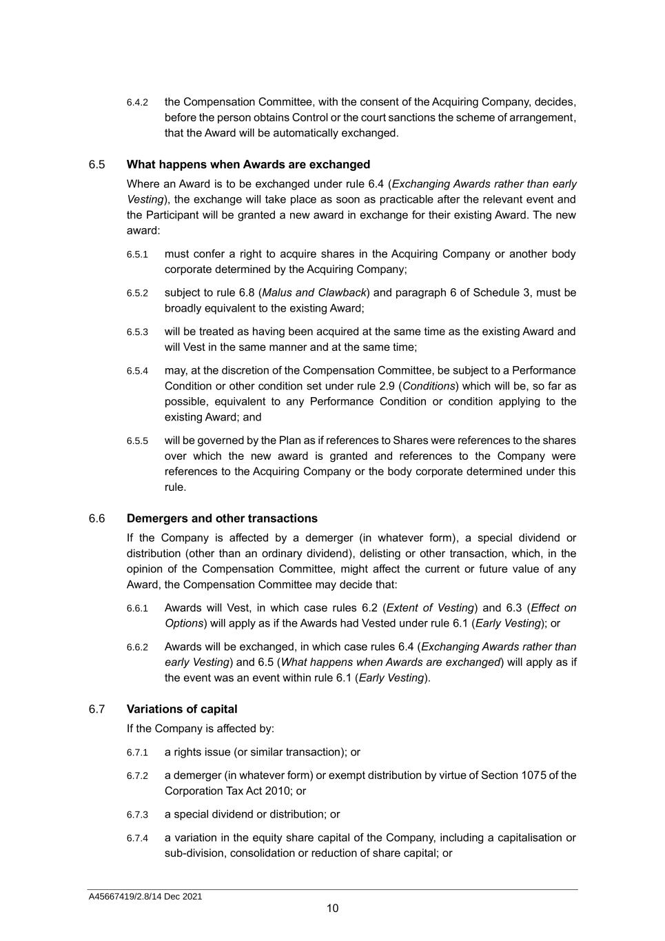 A45667419/2.8/14 Dec 2021 10 6.4.2 the Compensation Committee, with the consent of the Acquiring Company, decides, before the person obtains Control or the court sanctions the scheme of arrangement, that the Award will be automatically exchanged. 6.5 What happens when Awards are exchanged Where an Award is to be exchanged under rule 6.4 (Exchanging Awards rather than early Vesting), the exchange will take place as soon as practicable after the relevant event and the Participant will be granted a new award in exchange for their existing Award. The new award: 6.5.1 must confer a right to acquire shares in the Acquiring Company or another body corporate determined by the Acquiring Company; 6.5.2 subject to rule 6.8 (Malus and Clawback) and paragraph 6 of Schedule 3, must be broadly equivalent to the existing Award; 6.5.3 will be treated as having been acquired at the same time as the existing Award and will Vest in the same manner and at the same time; 6.5.4 may, at the discretion of the Compensation Committee, be subject to a Performance Condition or other condition set under rule 2.9 (Conditions) which will be, so far as possible, equivalent to any Performance Condition or condition applying to the existing Award; and 6.5.5 will be governed by the Plan as if references to Shares were references to the shares over which the new award is granted and references to the Company were references to the Acquiring Company or the body corporate determined under this rule. 6.6 Demergers and other transactions If the Company is affected by a demerger (in whatever form), a special dividend or distribution (other than an ordinary dividend), delisting or other transaction, which, in the opinion of the Compensation Committee, might affect the current or future value of any Award, the Compensation Committee may decide that: 6.6.1 Awards will Vest, in which case rules 6.2 (Extent of Vesting) and 6.3 (Effect on Options) will apply as if the Awards had Vested under rule 6.1 (Early Vesting); or 6.6.2 Awards will be exchanged, in which case rules 6.4 (Exchanging Awards rather than early Vesting) and 6.5 (What happens when Awards are exchanged) will apply as if the event was an event within rule 6.1 (Early Vesting). 6.7 Variations of capital If the Company is affected by: 6.7.1 a rights issue (or similar transaction); or 6.7.2 a demerger (in whatever form) or exempt distribution by virtue of Section 1075 of the Corporation Tax Act 2010; or 6.7.3 a special dividend or distribution; or 6.7.4 a variation in the equity share capital of the Company, including a capitalisation or sub-division, consolidation or reduction of share capital; or