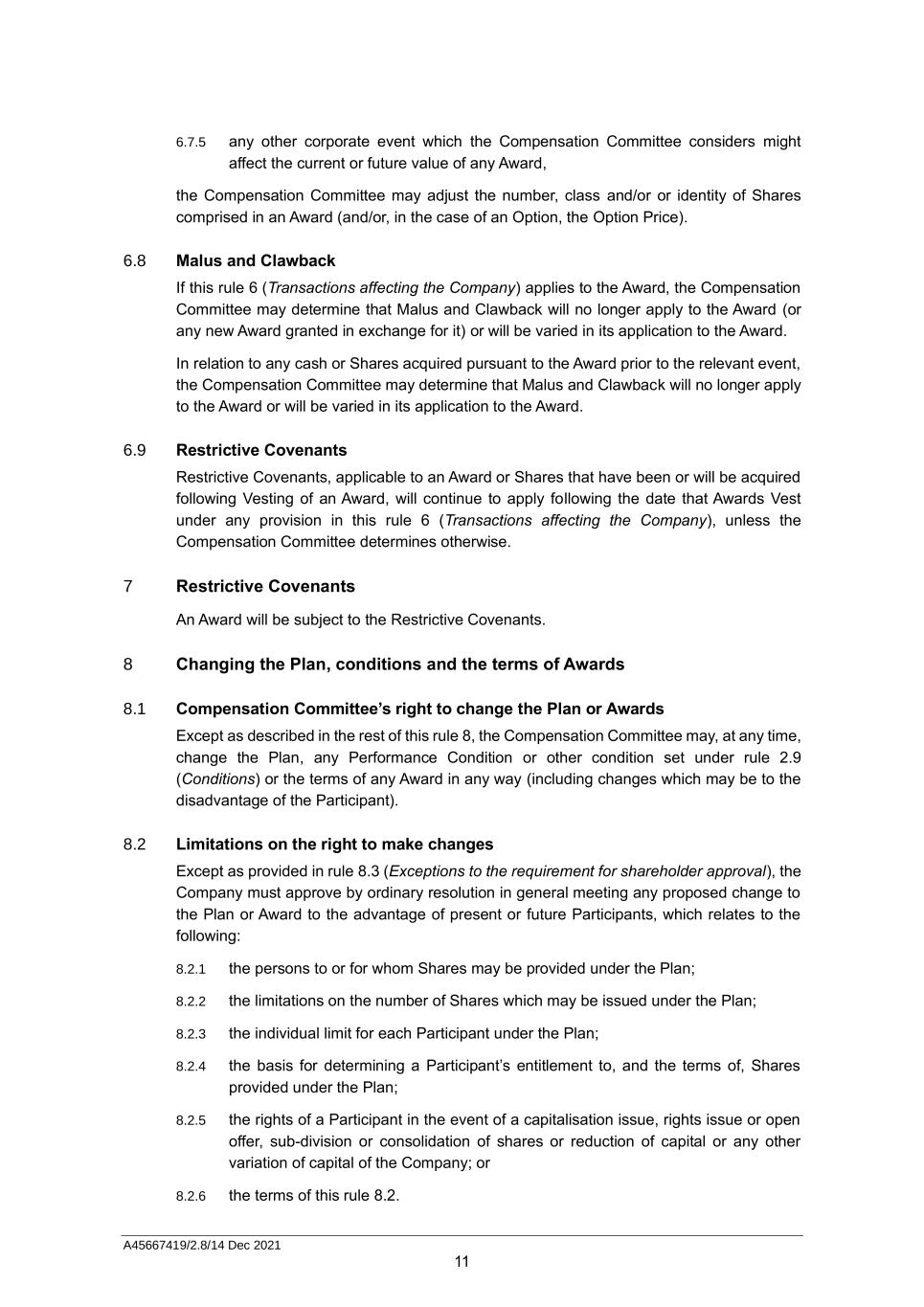 A45667419/2.8/14 Dec 2021 11 6.7.5 any other corporate event which the Compensation Committee considers might affect the current or future value of any Award, the Compensation Committee may adjust the number, class and/or or identity of Shares comprised in an Award (and/or, in the case of an Option, the Option Price). 6.8 Malus and Clawback If this rule 6 (Transactions affecting the Company) applies to the Award, the Compensation Committee may determine that Malus and Clawback will no longer apply to the Award (or any new Award granted in exchange for it) or will be varied in its application to the Award. In relation to any cash or Shares acquired pursuant to the Award prior to the relevant event, the Compensation Committee may determine that Malus and Clawback will no longer apply to the Award or will be varied in its application to the Award. 6.9 Restrictive Covenants Restrictive Covenants, applicable to an Award or Shares that have been or will be acquired following Vesting of an Award, will continue to apply following the date that Awards Vest under any provision in this rule 6 (Transactions affecting the Company), unless the Compensation Committee determines otherwise. 7 Restrictive Covenants An Award will be subject to the Restrictive Covenants. 8 Changing the Plan, conditions and the terms of Awards 8.1 Compensation Committee’s right to change the Plan or Awards Except as described in the rest of this rule 8, the Compensation Committee may, at any time, change the Plan, any Performance Condition or other condition set under rule 2.9 (Conditions) or the terms of any Award in any way (including changes which may be to the disadvantage of the Participant). 8.2 Limitations on the right to make changes Except as provided in rule 8.3 (Exceptions to the requirement for shareholder approval), the Company must approve by ordinary resolution in general meeting any proposed change to the Plan or Award to the advantage of present or future Participants, which relates to the following: 8.2.1 the persons to or for whom Shares may be provided under the Plan; 8.2.2 the limitations on the number of Shares which may be issued under the Plan; 8.2.3 the individual limit for each Participant under the Plan; 8.2.4 the basis for determining a Participant’s entitlement to, and the terms of, Shares provided under the Plan; 8.2.5 the rights of a Participant in the event of a capitalisation issue, rights issue or open offer, sub-division or consolidation of shares or reduction of capital or any other variation of capital of the Company; or 8.2.6 the terms of this rule 8.2.