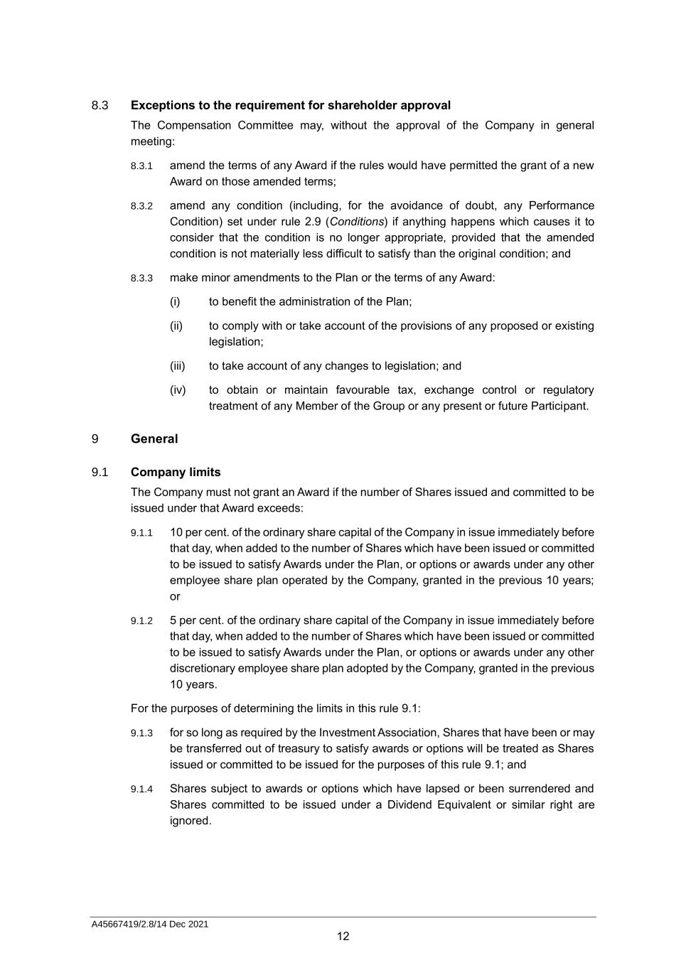 A45667419/2.8/14 Dec 2021 12 8.3 Exceptions to the requirement for shareholder approval The Compensation Committee may, without the approval of the Company in general meeting: 8.3.1 amend the terms of any Award if the rules would have permitted the grant of a new Award on those amended terms; 8.3.2 amend any condition (including, for the avoidance of doubt, any Performance Condition) set under rule 2.9 (Conditions) if anything happens which causes it to consider that the condition is no longer appropriate, provided that the amended condition is not materially less difficult to satisfy than the original condition; and 8.3.3 make minor amendments to the Plan or the terms of any Award: (i) to benefit the administration of the Plan; (ii) to comply with or take account of the provisions of any proposed or existing legislation; (iii) to take account of any changes to legislation; and (iv) to obtain or maintain favourable tax, exchange control or regulatory treatment of any Member of the Group or any present or future Participant. 9 General 9.1 Company limits The Company must not grant an Award if the number of Shares issued and committed to be issued under that Award exceeds: 9.1.1 10 per cent. of the ordinary share capital of the Company in issue immediately before that day, when added to the number of Shares which have been issued or committed to be issued to satisfy Awards under the Plan, or options or awards under any other employee share plan operated by the Company, granted in the previous 10 years; or 9.1.2 5 per cent. of the ordinary share capital of the Company in issue immediately before that day, when added to the number of Shares which have been issued or committed to be issued to satisfy Awards under the Plan, or options or awards under any other discretionary employee share plan adopted by the Company, granted in the previous 10 years. For the purposes of determining the limits in this rule 9.1: 9.1.3 for so long as required by the Investment Association, Shares that have been or may be transferred out of treasury to satisfy awards or options will be treated as Shares issued or committed to be issued for the purposes of this rule 9.1; and 9.1.4 Shares subject to awards or options which have lapsed or been surrendered and Shares committed to be issued under a Dividend Equivalent or similar right are ignored.