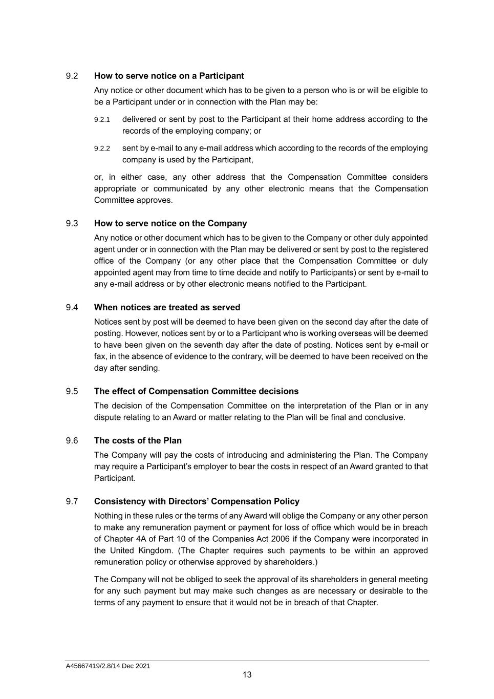 A45667419/2.8/14 Dec 2021 13 9.2 How to serve notice on a Participant Any notice or other document which has to be given to a person who is or will be eligible to be a Participant under or in connection with the Plan may be: 9.2.1 delivered or sent by post to the Participant at their home address according to the records of the employing company; or 9.2.2 sent by e-mail to any e-mail address which according to the records of the employing company is used by the Participant, or, in either case, any other address that the Compensation Committee considers appropriate or communicated by any other electronic means that the Compensation Committee approves. 9.3 How to serve notice on the Company Any notice or other document which has to be given to the Company or other duly appointed agent under or in connection with the Plan may be delivered or sent by post to the registered office of the Company (or any other place that the Compensation Committee or duly appointed agent may from time to time decide and notify to Participants) or sent by e-mail to any e-mail address or by other electronic means notified to the Participant. 9.4 When notices are treated as served Notices sent by post will be deemed to have been given on the second day after the date of posting. However, notices sent by or to a Participant who is working overseas will be deemed to have been given on the seventh day after the date of posting. Notices sent by e-mail or fax, in the absence of evidence to the contrary, will be deemed to have been received on the day after sending. 9.5 The effect of Compensation Committee decisions The decision of the Compensation Committee on the interpretation of the Plan or in any dispute relating to an Award or matter relating to the Plan will be final and conclusive. 9.6 The costs of the Plan The Company will pay the costs of introducing and administering the Plan. The Company may require a Participant’s employer to bear the costs in respect of an Award granted to that Participant. 9.7 Consistency with Directors’ Compensation Policy Nothing in these rules or the terms of any Award will oblige the Company or any other person to make any remuneration payment or payment for loss of office which would be in breach of Chapter 4A of Part 10 of the Companies Act 2006 if the Company were incorporated in the United Kingdom. (The Chapter requires such payments to be within an approved remuneration policy or otherwise approved by shareholders.) The Company will not be obliged to seek the approval of its shareholders in general meeting for any such payment but may make such changes as are necessary or desirable to the terms of any payment to ensure that it would not be in breach of that Chapter.