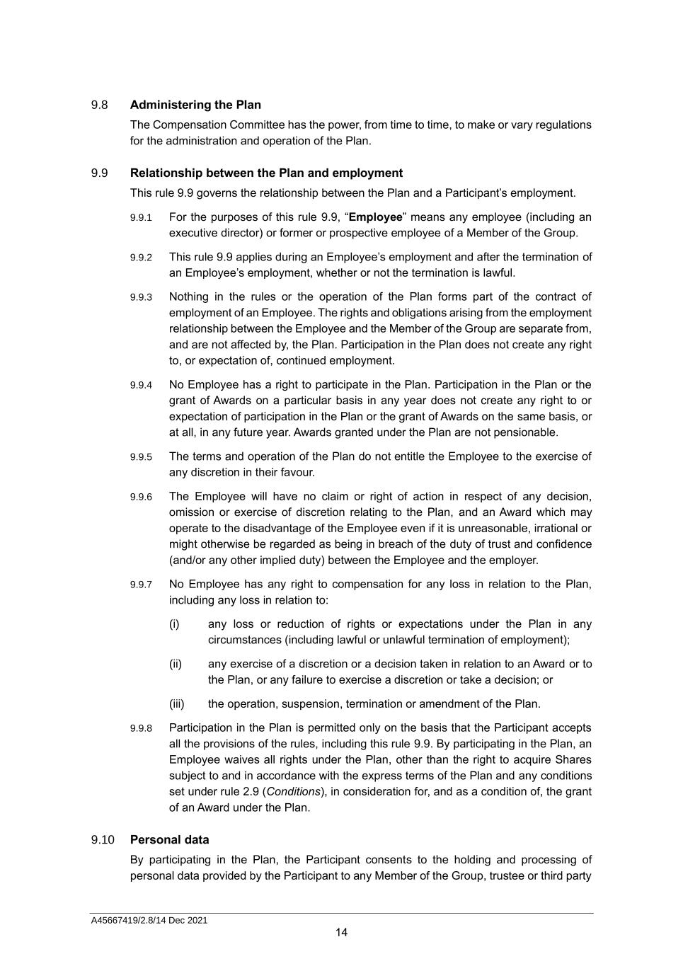 A45667419/2.8/14 Dec 2021 14 9.8 Administering the Plan The Compensation Committee has the power, from time to time, to make or vary regulations for the administration and operation of the Plan. 9.9 Relationship between the Plan and employment This rule 9.9 governs the relationship between the Plan and a Participant’s employment. 9.9.1 For the purposes of this rule 9.9, “Employee” means any employee (including an executive director) or former or prospective employee of a Member of the Group. 9.9.2 This rule 9.9 applies during an Employee’s employment and after the termination of an Employee’s employment, whether or not the termination is lawful. 9.9.3 Nothing in the rules or the operation of the Plan forms part of the contract of employment of an Employee. The rights and obligations arising from the employment relationship between the Employee and the Member of the Group are separate from, and are not affected by, the Plan. Participation in the Plan does not create any right to, or expectation of, continued employment. 9.9.4 No Employee has a right to participate in the Plan. Participation in the Plan or the grant of Awards on a particular basis in any year does not create any right to or expectation of participation in the Plan or the grant of Awards on the same basis, or at all, in any future year. Awards granted under the Plan are not pensionable. 9.9.5 The terms and operation of the Plan do not entitle the Employee to the exercise of any discretion in their favour. 9.9.6 The Employee will have no claim or right of action in respect of any decision, omission or exercise of discretion relating to the Plan, and an Award which may operate to the disadvantage of the Employee even if it is unreasonable, irrational or might otherwise be regarded as being in breach of the duty of trust and confidence (and/or any other implied duty) between the Employee and the employer. 9.9.7 No Employee has any right to compensation for any loss in relation to the Plan, including any loss in relation to: (i) any loss or reduction of rights or expectations under the Plan in any circumstances (including lawful or unlawful termination of employment); (ii) any exercise of a discretion or a decision taken in relation to an Award or to the Plan, or any failure to exercise a discretion or take a decision; or (iii) the operation, suspension, termination or amendment of the Plan. 9.9.8 Participation in the Plan is permitted only on the basis that the Participant accepts all the provisions of the rules, including this rule 9.9. By participating in the Plan, an Employee waives all rights under the Plan, other than the right to acquire Shares subject to and in accordance with the express terms of the Plan and any conditions set under rule 2.9 (Conditions), in consideration for, and as a condition of, the grant of an Award under the Plan. 9.10 Personal data By participating in the Plan, the Participant consents to the holding and processing of personal data provided by the Participant to any Member of the Group, trustee or third party