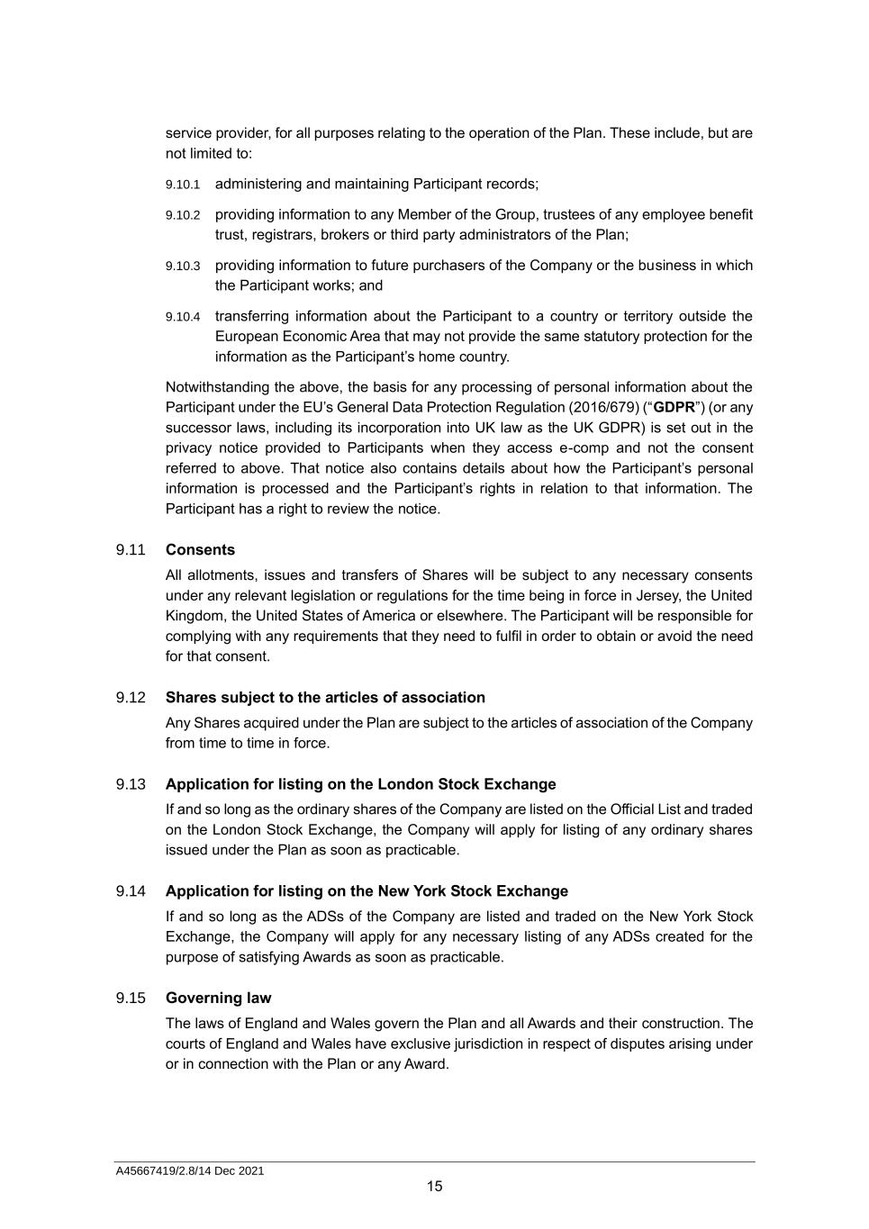 A45667419/2.8/14 Dec 2021 15 service provider, for all purposes relating to the operation of the Plan. These include, but are not limited to: 9.10.1 administering and maintaining Participant records; 9.10.2 providing information to any Member of the Group, trustees of any employee benefit trust, registrars, brokers or third party administrators of the Plan; 9.10.3 providing information to future purchasers of the Company or the business in which the Participant works; and 9.10.4 transferring information about the Participant to a country or territory outside the European Economic Area that may not provide the same statutory protection for the information as the Participant’s home country. Notwithstanding the above, the basis for any processing of personal information about the Participant under the EU’s General Data Protection Regulation (2016/679) (“GDPR”) (or any successor laws, including its incorporation into UK law as the UK GDPR) is set out in the privacy notice provided to Participants when they access e-comp and not the consent referred to above. That notice also contains details about how the Participant’s personal information is processed and the Participant’s rights in relation to that information. The Participant has a right to review the notice. 9.11 Consents All allotments, issues and transfers of Shares will be subject to any necessary consents under any relevant legislation or regulations for the time being in force in Jersey, the United Kingdom, the United States of America or elsewhere. The Participant will be responsible for complying with any requirements that they need to fulfil in order to obtain or avoid the need for that consent. 9.12 Shares subject to the articles of association Any Shares acquired under the Plan are subject to the articles of association of the Company from time to time in force. 9.13 Application for listing on the London Stock Exchange If and so long as the ordinary shares of the Company are listed on the Official List and traded on the London Stock Exchange, the Company will apply for listing of any ordinary shares issued under the Plan as soon as practicable. 9.14 Application for listing on the New York Stock Exchange If and so long as the ADSs of the Company are listed and traded on the New York Stock Exchange, the Company will apply for any necessary listing of any ADSs created for the purpose of satisfying Awards as soon as practicable. 9.15 Governing law The laws of England and Wales govern the Plan and all Awards and their construction. The courts of England and Wales have exclusive jurisdiction in respect of disputes arising under or in connection with the Plan or any Award.