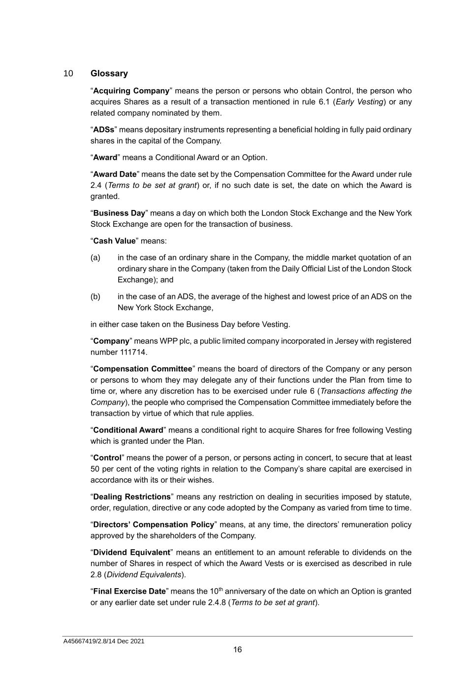 A45667419/2.8/14 Dec 2021 16 10 Glossary “Acquiring Company” means the person or persons who obtain Control, the person who acquires Shares as a result of a transaction mentioned in rule 6.1 (Early Vesting) or any related company nominated by them. “ADSs” means depositary instruments representing a beneficial holding in fully paid ordinary shares in the capital of the Company. “Award” means a Conditional Award or an Option. “Award Date” means the date set by the Compensation Committee for the Award under rule 2.4 (Terms to be set at grant) or, if no such date is set, the date on which the Award is granted. “Business Day” means a day on which both the London Stock Exchange and the New York Stock Exchange are open for the transaction of business. “Cash Value” means: (a) in the case of an ordinary share in the Company, the middle market quotation of an ordinary share in the Company (taken from the Daily Official List of the London Stock Exchange); and (b) in the case of an ADS, the average of the highest and lowest price of an ADS on the New York Stock Exchange, in either case taken on the Business Day before Vesting. “Company” means WPP plc, a public limited company incorporated in Jersey with registered number 111714. “Compensation Committee” means the board of directors of the Company or any person or persons to whom they may delegate any of their functions under the Plan from time to time or, where any discretion has to be exercised under rule 6 (Transactions affecting the Company), the people who comprised the Compensation Committee immediately before the transaction by virtue of which that rule applies. “Conditional Award” means a conditional right to acquire Shares for free following Vesting which is granted under the Plan. “Control” means the power of a person, or persons acting in concert, to secure that at least 50 per cent of the voting rights in relation to the Company’s share capital are exercised in accordance with its or their wishes. “Dealing Restrictions” means any restriction on dealing in securities imposed by statute, order, regulation, directive or any code adopted by the Company as varied from time to time. “Directors’ Compensation Policy” means, at any time, the directors’ remuneration policy approved by the shareholders of the Company. “Dividend Equivalent” means an entitlement to an amount referable to dividends on the number of Shares in respect of which the Award Vests or is exercised as described in rule 2.8 (Dividend Equivalents). “Final Exercise Date” means the 10th anniversary of the date on which an Option is granted or any earlier date set under rule 2.4.8 (Terms to be set at grant).