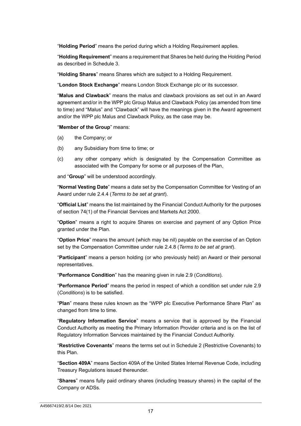 A45667419/2.8/14 Dec 2021 17 “Holding Period” means the period during which a Holding Requirement applies. “Holding Requirement” means a requirement that Shares be held during the Holding Period as described in Schedule 3. “Holding Shares” means Shares which are subject to a Holding Requirement. “London Stock Exchange” means London Stock Exchange plc or its successor. “Malus and Clawback” means the malus and clawback provisions as set out in an Award agreement and/or in the WPP plc Group Malus and Clawback Policy (as amended from time to time) and “Malus” and “Clawback” will have the meanings given in the Award agreement and/or the WPP plc Malus and Clawback Policy, as the case may be. “Member of the Group” means: (a) the Company; or (b) any Subsidiary from time to time; or (c) any other company which is designated by the Compensation Committee as associated with the Company for some or all purposes of the Plan, and “Group” will be understood accordingly. “Normal Vesting Date” means a date set by the Compensation Committee for Vesting of an Award under rule 2.4.4 (Terms to be set at grant). “Official List” means the list maintained by the Financial Conduct Authority for the purposes of section 74(1) of the Financial Services and Markets Act 2000. “Option” means a right to acquire Shares on exercise and payment of any Option Price granted under the Plan. “Option Price” means the amount (which may be nil) payable on the exercise of an Option set by the Compensation Committee under rule 2.4.8 (Terms to be set at grant). “Participant” means a person holding (or who previously held) an Award or their personal representatives. “Performance Condition” has the meaning given in rule 2.9 (Conditions). “Performance Period” means the period in respect of which a condition set under rule 2.9 (Conditions) is to be satisfied. “Plan” means these rules known as the “WPP plc Executive Performance Share Plan” as changed from time to time. “Regulatory Information Service” means a service that is approved by the Financial Conduct Authority as meeting the Primary Information Provider criteria and is on the list of Regulatory Information Services maintained by the Financial Conduct Authority. “Restrictive Covenants” means the terms set out in Schedule 2 (Restrictive Covenants) to this Plan. “Section 409A” means Section 409A of the United States Internal Revenue Code, including Treasury Regulations issued thereunder. “Shares” means fully paid ordinary shares (including treasury shares) in the capital of the Company or ADSs.