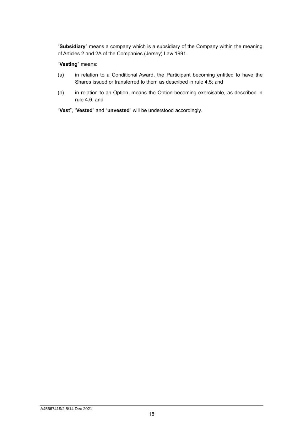 A45667419/2.8/14 Dec 2021 18 “Subsidiary” means a company which is a subsidiary of the Company within the meaning of Articles 2 and 2A of the Companies (Jersey) Law 1991. “Vesting” means: (a) in relation to a Conditional Award, the Participant becoming entitled to have the Shares issued or transferred to them as described in rule 4.5; and (b) in relation to an Option, means the Option becoming exercisable, as described in rule 4.6, and “Vest”, “Vested” and “unvested” will be understood accordingly.