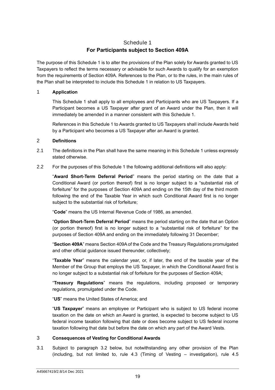 A45667419/2.8/14 Dec 2021 19 Schedule 1 For Participants subject to Section 409A The purpose of this Schedule 1 is to alter the provisions of the Plan solely for Awards granted to US Taxpayers to reflect the terms necessary or advisable for such Awards to qualify for an exemption from the requirements of Section 409A. References to the Plan, or to the rules, in the main rules of the Plan shall be interpreted to include this Schedule 1 in relation to US Taxpayers. 1 Application This Schedule 1 shall apply to all employees and Participants who are US Taxpayers. If a Participant becomes a US Taxpayer after grant of an Award under the Plan, then it will immediately be amended in a manner consistent with this Schedule 1. References in this Schedule 1 to Awards granted to US Taxpayers shall include Awards held by a Participant who becomes a US Taxpayer after an Award is granted. 2 Definitions 2.1 The definitions in the Plan shall have the same meaning in this Schedule 1 unless expressly stated otherwise. 2.2 For the purposes of this Schedule 1 the following additional definitions will also apply: “Award Short-Term Deferral Period” means the period starting on the date that a Conditional Award (or portion thereof) first is no longer subject to a “substantial risk of forfeiture” for the purposes of Section 409A and ending on the 15th day of the third month following the end of the Taxable Year in which such Conditional Award first is no longer subject to the substantial risk of forfeiture; “Code” means the US Internal Revenue Code of 1986, as amended. “Option Short-Term Deferral Period” means the period starting on the date that an Option (or portion thereof) first is no longer subject to a “substantial risk of forfeiture” for the purposes of Section 409A and ending on the immediately following 31 December; “Section 409A” means Section 409A of the Code and the Treasury Regulations promulgated and other official guidance issued thereunder, collectively; “Taxable Year” means the calendar year, or, if later, the end of the taxable year of the Member of the Group that employs the US Taxpayer, in which the Conditional Award first is no longer subject to a substantial risk of forfeiture for the purposes of Section 409A; “Treasury Regulations” means the regulations, including proposed or temporary regulations, promulgated under the Code. “US” means the United States of America; and “US Taxpayer” means an employee or Participant who is subject to US federal income taxation on the date on which an Award is granted, is expected to become subject to US federal income taxation following that date or does become subject to US federal income taxation following that date but before the date on which any part of the Award Vests. 3 Consequences of Vesting for Conditional Awards 3.1 Subject to paragraph 3.2 below, but notwithstanding any other provision of the Plan (including, but not limited to, rule 4.3 (Timing of Vesting – investigation), rule 4.5